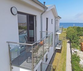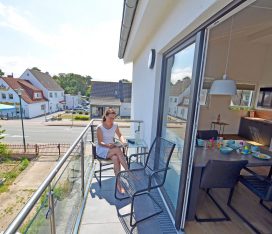 Ostbalkon mit seitlichem Meerblick, kleiner Tisch und 2 bequeme Balkonstühle
