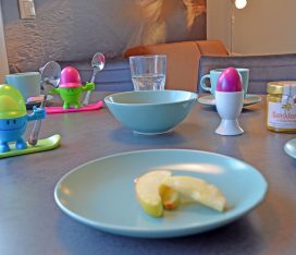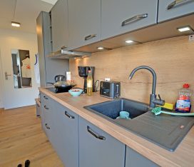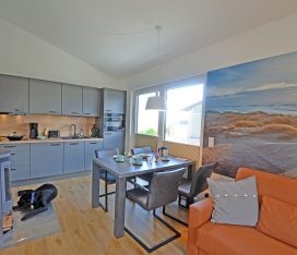 Wohn- Esszimmer mit offenem Küchenbereich, gemütliche Schlafcouch mit bis zu 2 Liegeplätzen mit durchgängiger Matratze und Topper (Liegefläche: 170×200 cm), TV/Sat (Flatscreen), Internet/ WLAN (Fritzbox) ist kostenfrei, Fußbodenheizung, Kaminofen, Bücher und Gesellschaftsspiele für gemütliche Abende, komplett mit Geschirr ausgestattete Einbauküche mit 4- Plattenherd (Ceranfeld), Backofen mit integrierter Mikrowelle, Kühlschrank mit kleinem Gefrierfach, Geschirrspüler, Kaffeemaschine (Filter), Cafissimo Kapselmaschine, Toaster und Wasserkocher