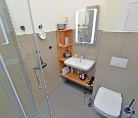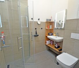 modernes Bad mit Dusche/ WC, Kosmetikspiegel und Haartrockner