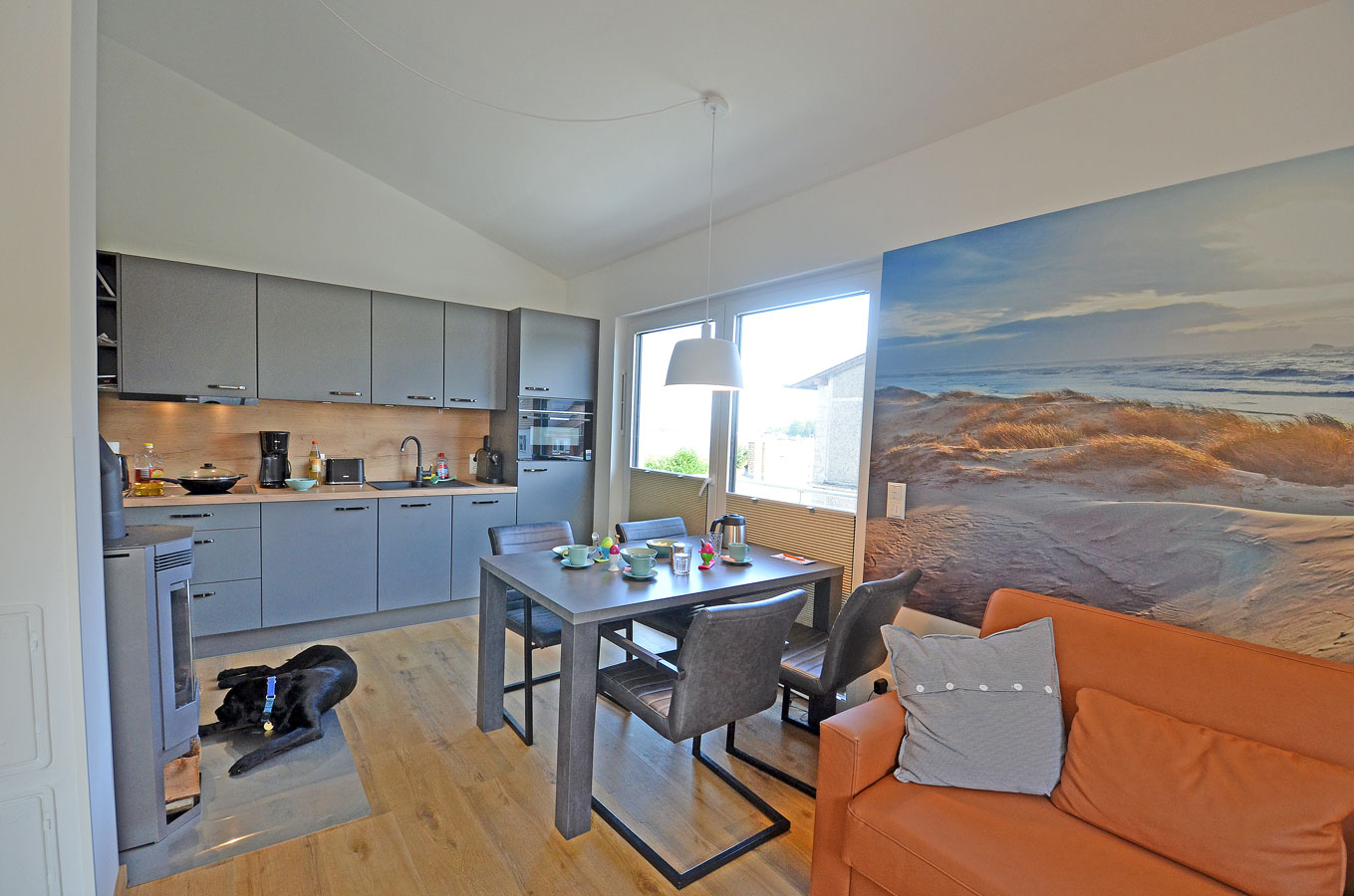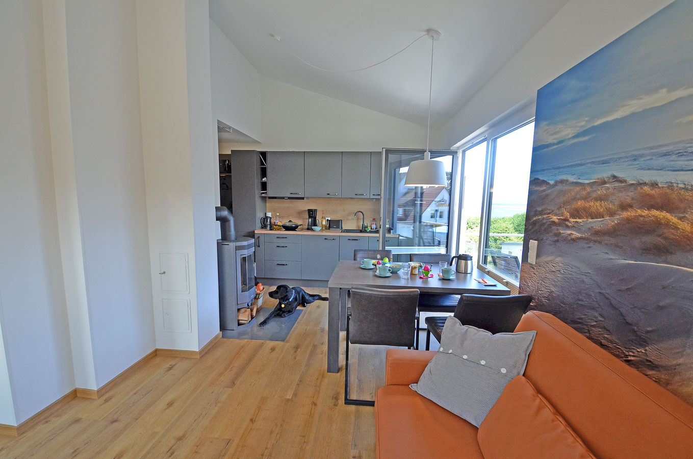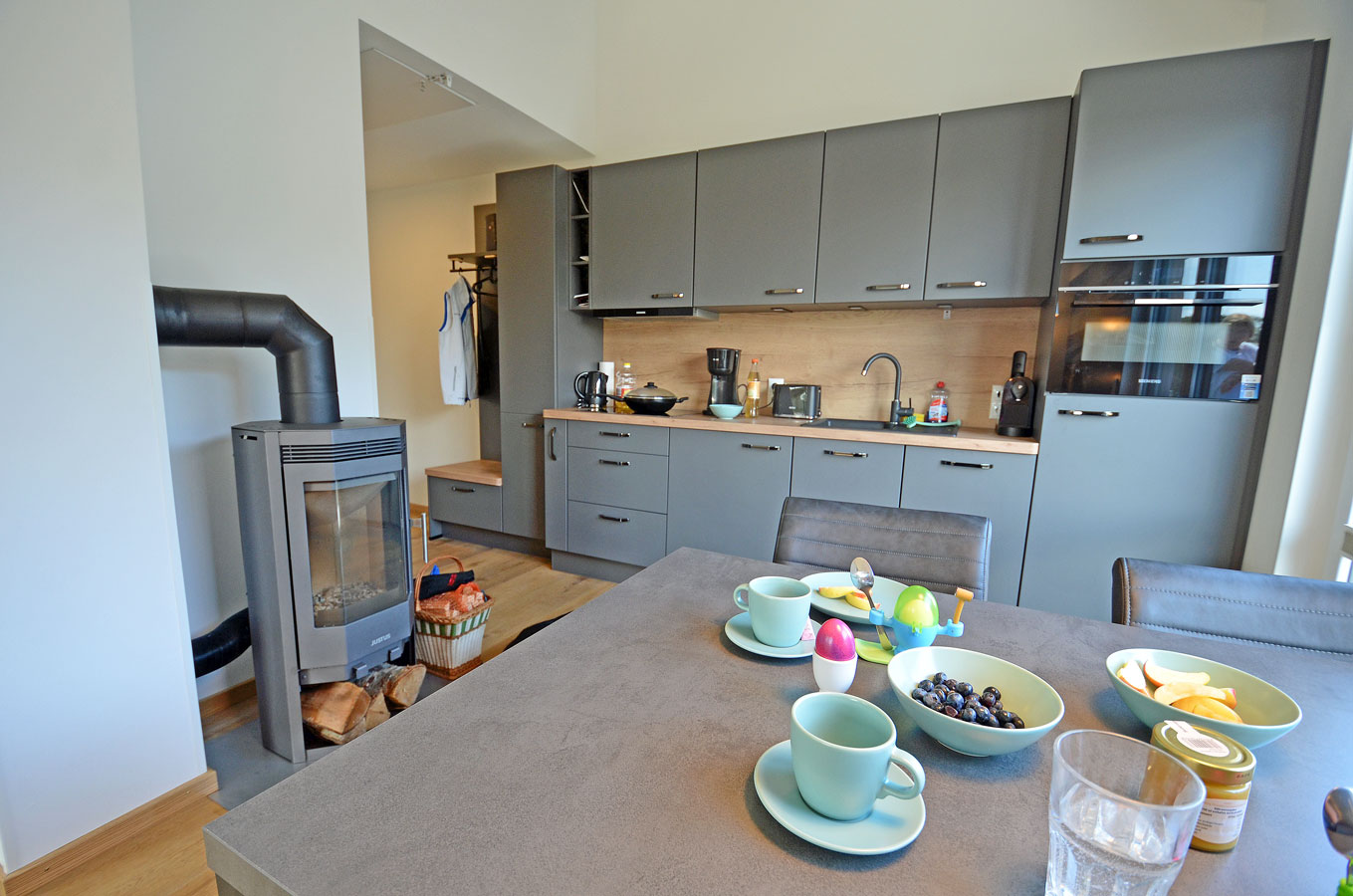 Wohn- Esszimmer mit offenem Küchenbereich, gemütliche Schlafcouch mit bis zu 2 Liegeplätzen mit durchgängiger Matratze und Topper (Liegefläche: 170×200 cm), TV/Sat (Flatscreen), Internet/ WLAN (Fritzbox) ist kostenfrei, Fußbodenheizung, Kaminofen, Bücher und Gesellschaftsspiele für gemütliche Abende, komplett mit Geschirr ausgestattete Einbauküche mit 4- Plattenherd (Ceranfeld), Backofen mit integrierter Mikrowelle, Kühlschrank mit kleinem Gefrierfach, Geschirrspüler, Kaffeemaschine (Filter), Cafissimo Kapselmaschine, Toaster und Wasserkocher