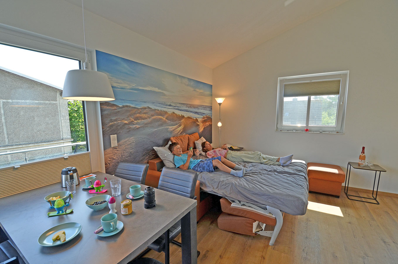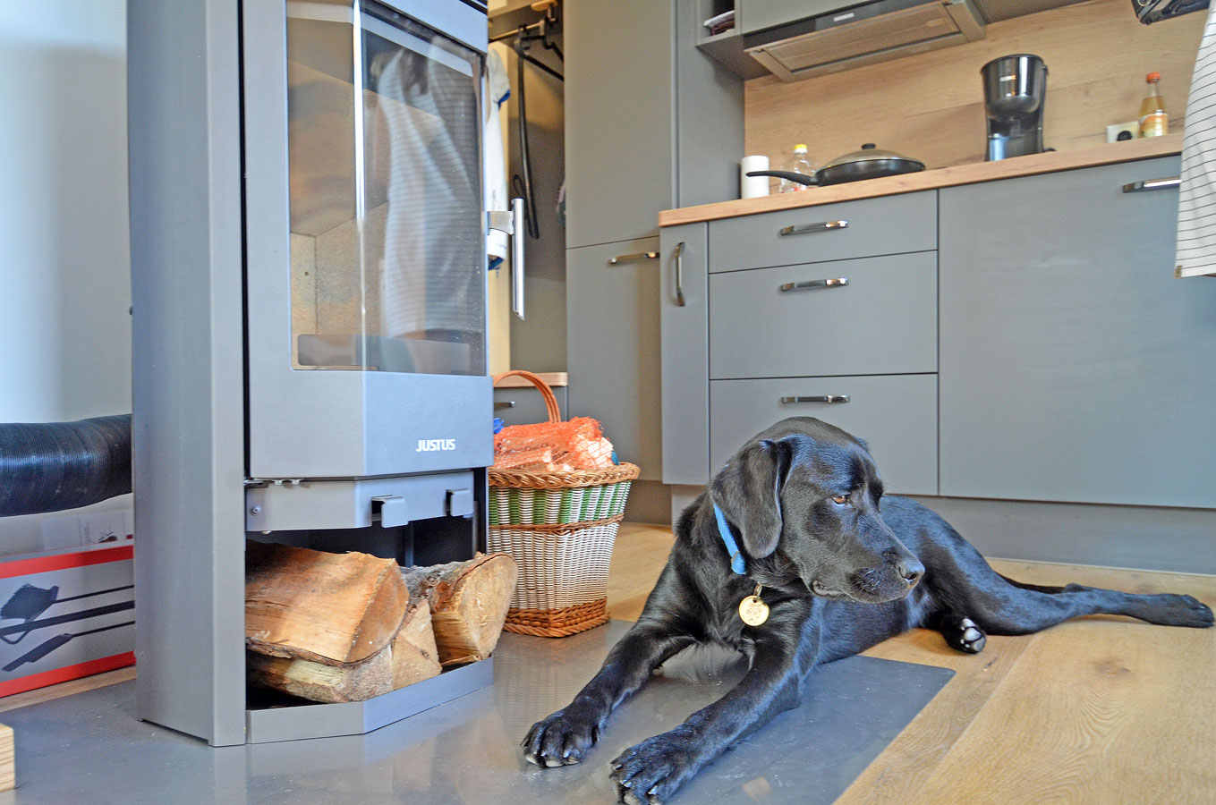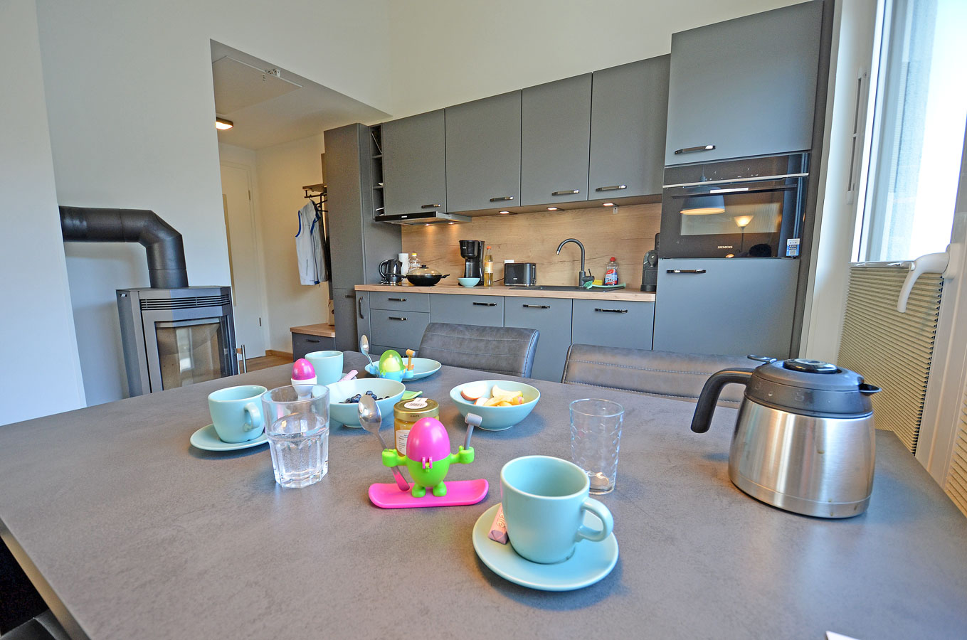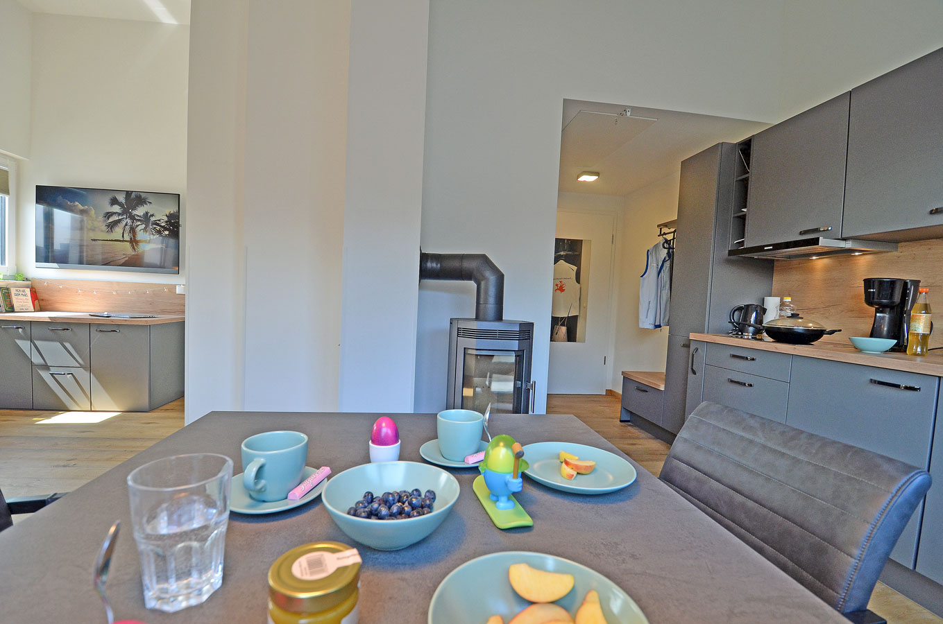 Wohn- Esszimmer mit offenem Küchenbereich, gemütliche Schlafcouch mit bis zu 2 Liegeplätzen mit durchgängiger Matratze und Topper (Liegefläche: 170×200 cm), TV/Sat (Flatscreen), Internet/ WLAN (Fritzbox) ist kostenfrei, Fußbodenheizung, Kaminofen, Bücher und Gesellschaftsspiele für gemütliche Abende, komplett mit Geschirr ausgestattete Einbauküche mit 4- Plattenherd (Ceranfeld), Backofen mit integrierter Mikrowelle, Kühlschrank mit kleinem Gefrierfach, Geschirrspüler, Kaffeemaschine (Filter), Cafissimo Kapselmaschine, Toaster und Wasserkocher