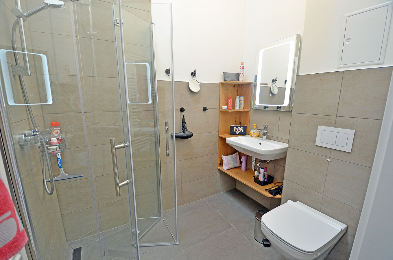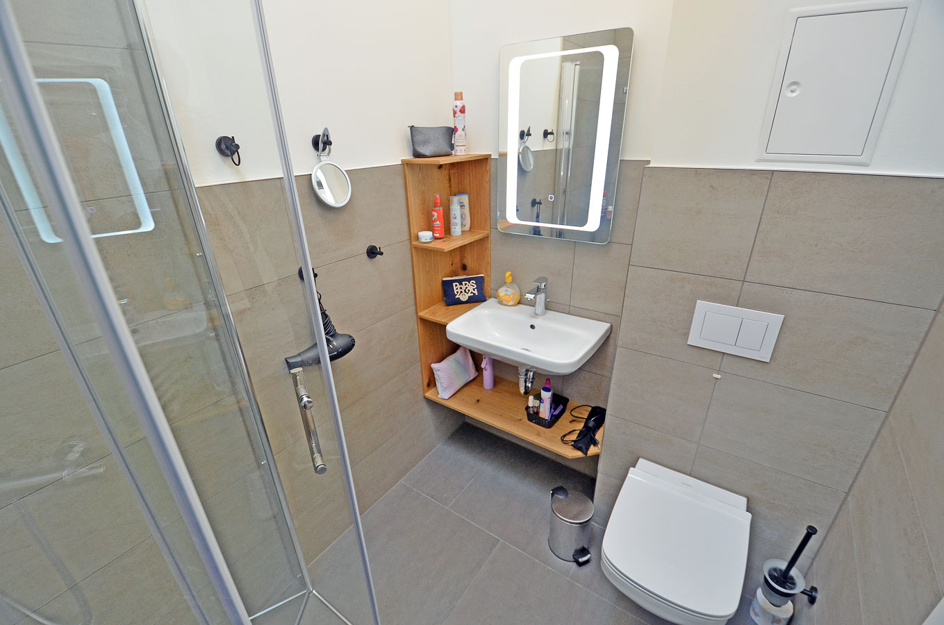 modernes Bad mit Dusche/ WC, Kosmetikspiegel und Haartrockner