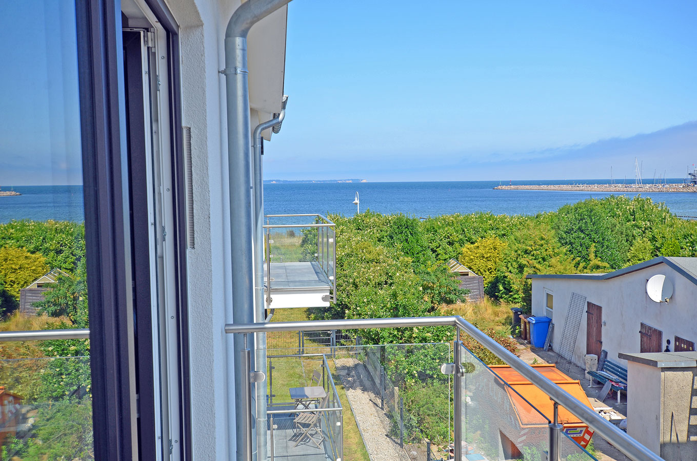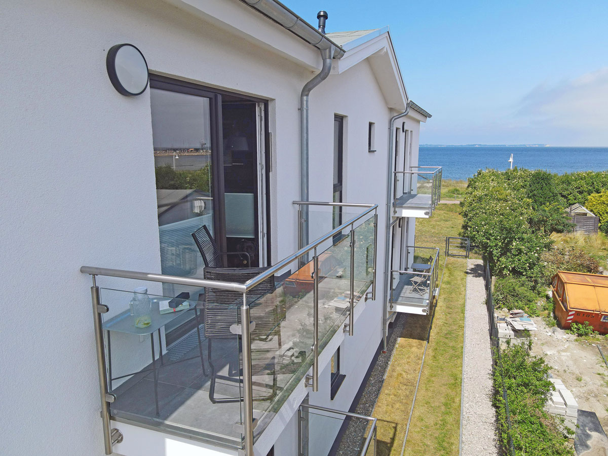 Ostbalkon mit seitlichem Meerblick, kleiner Tisch und 2 bequeme Balkonstühle