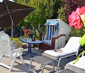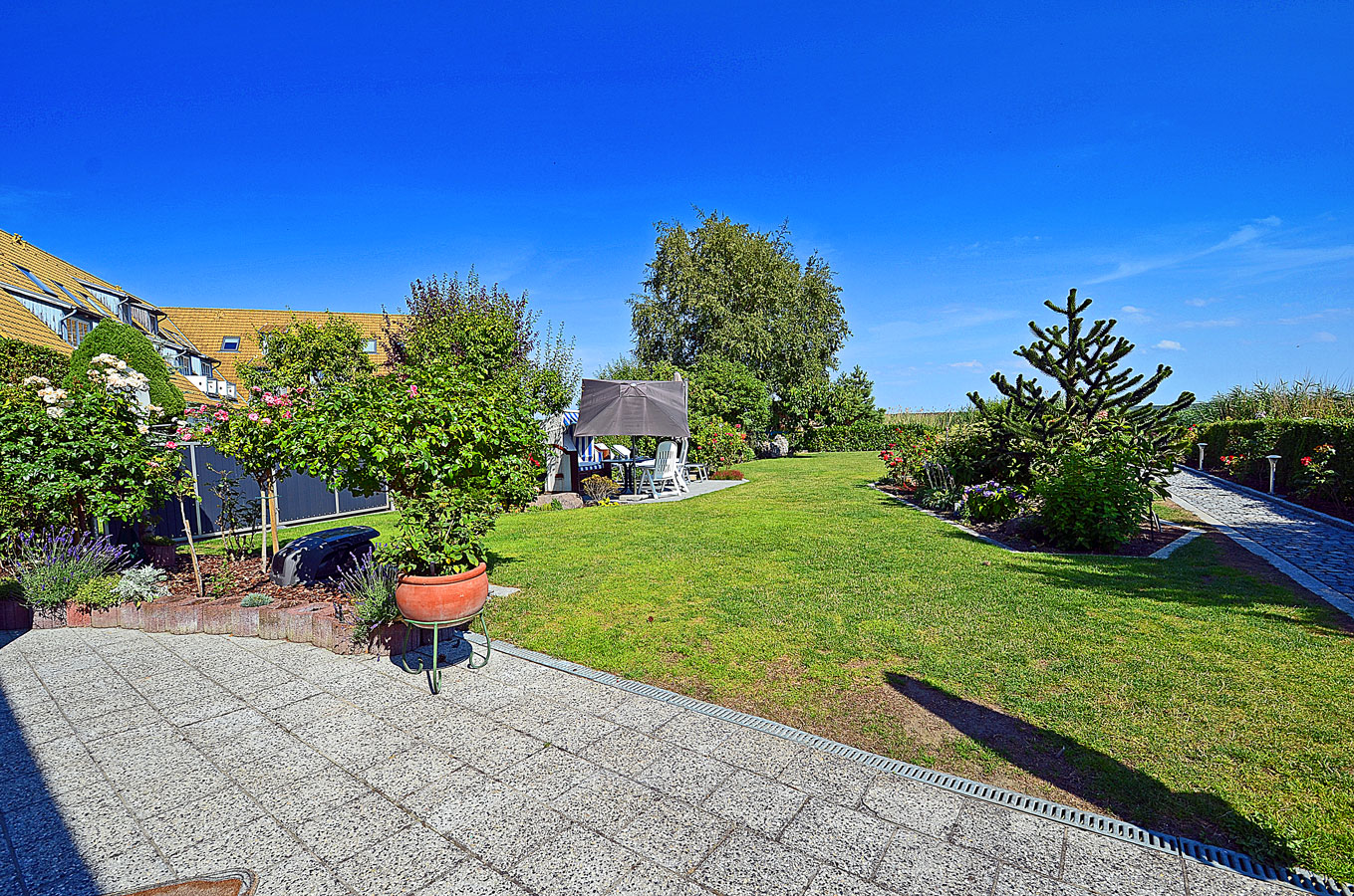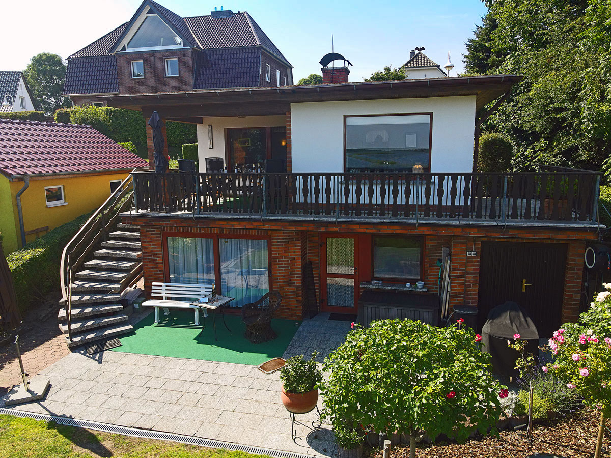 Außenbereich: Terrasse mit Gartenmöbeln, sehr gepflegter Garten mit Strandkorb, Sonnenliegen mit Auflagen, Sonnenschirm sowie Grill vorhanden, hauseigener Stegzugang mit Gartenbank