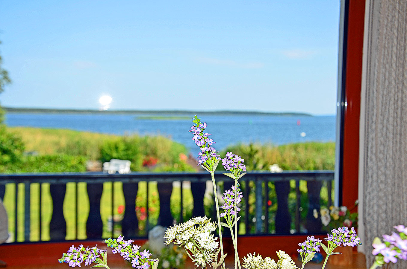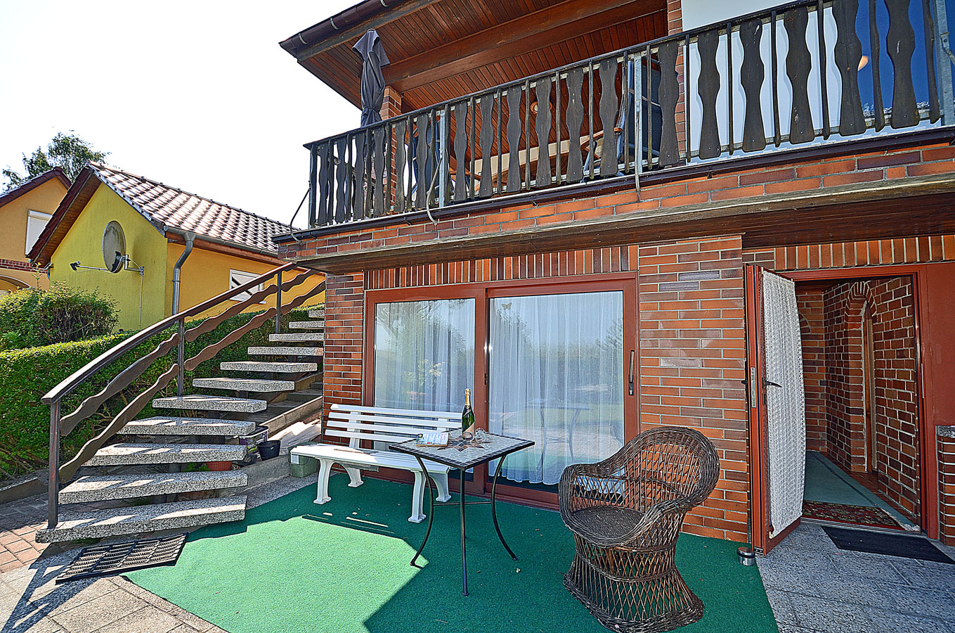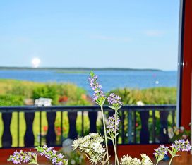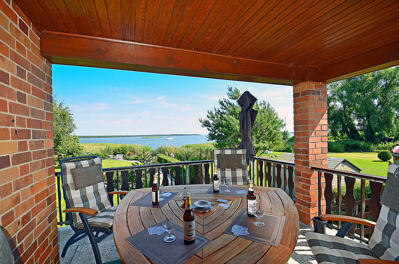 Obergeschoss nur von der Außentreppe erreichbar!: großer Balkon mit traumhaftem Blick auf den Bodden, bequemen Gartenmöbeln und Sonnenschirm