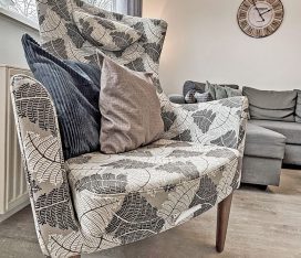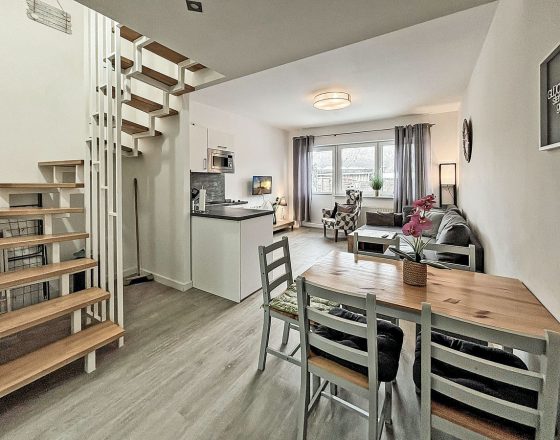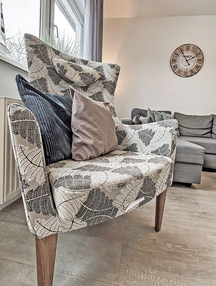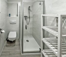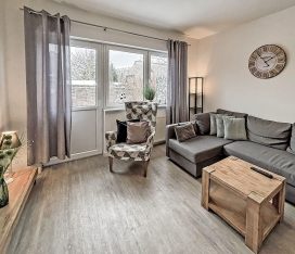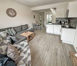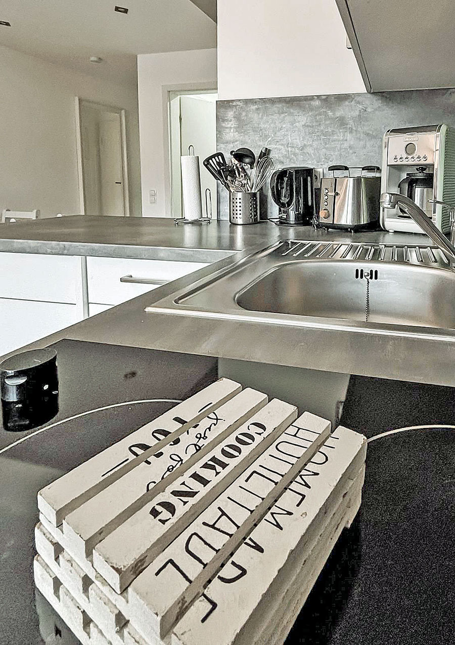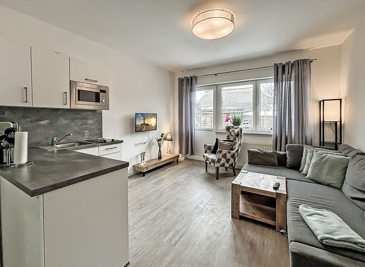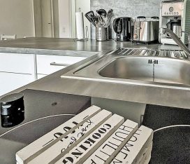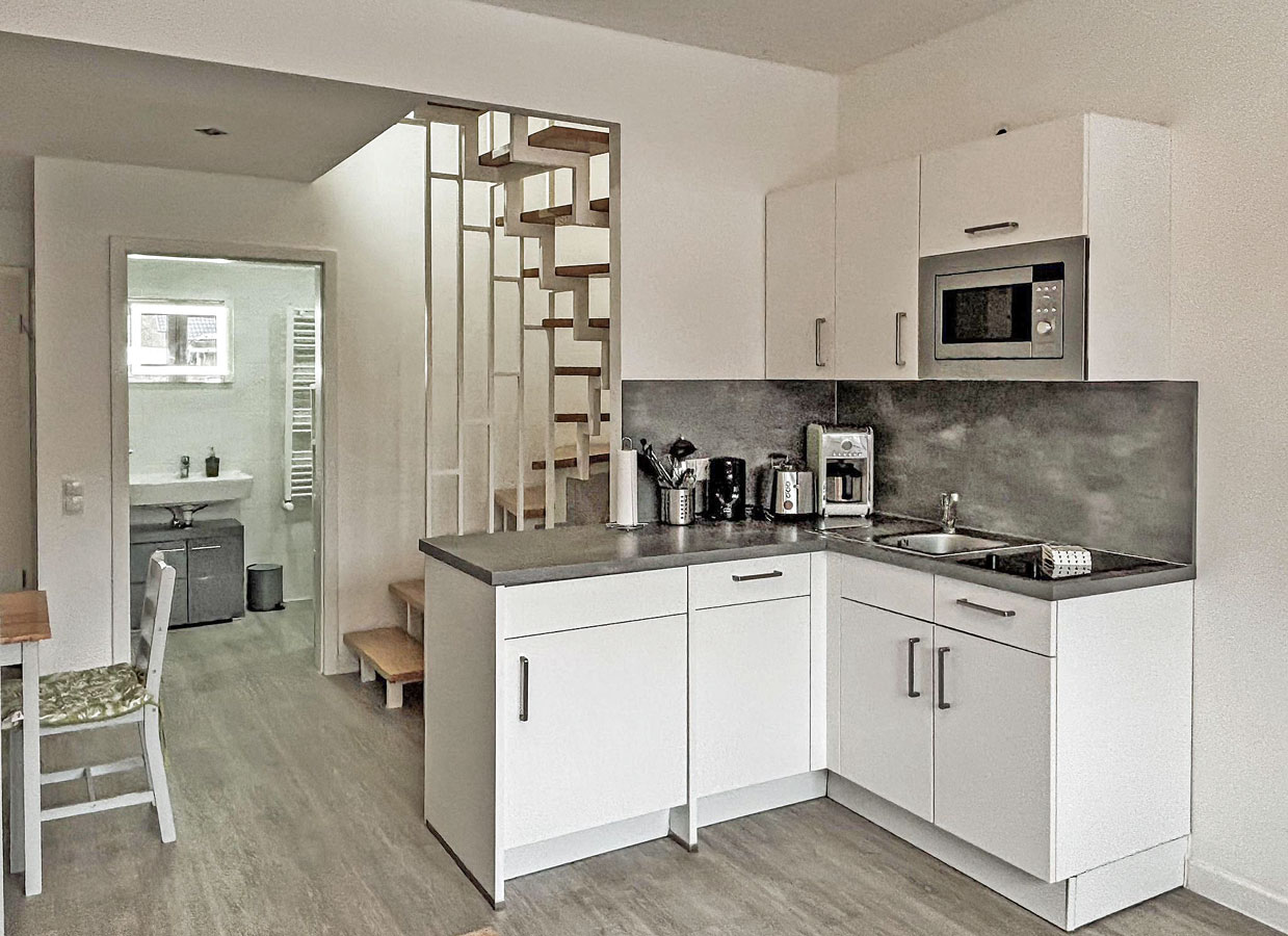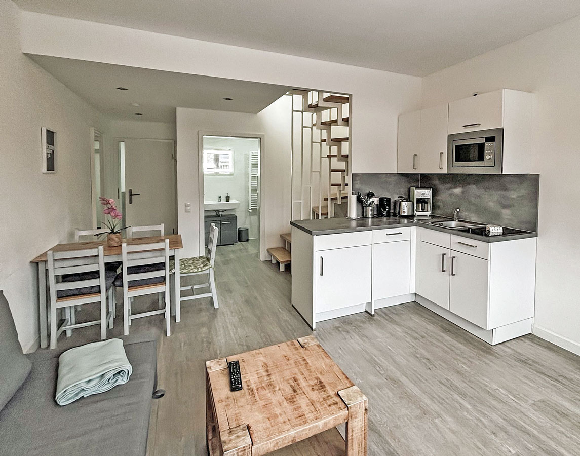 Parterre: moderner Wohn- Essbereich mit Terrassenzugang, gemütlicher Couch mit Schlaffunktion (für eine Person), TV/ Sat (Flatscreen), offene komplett ausgestattete Einbauküche mit 2- Plattenherd (Ceranfeld), Backofen, Kühlschrank mit kleinem Gefrierfach, Geschirrspüler, Mikrowelle, Filterkaffeemaschine und diversen Elektrogeräten, modernes Bad mit Dusche und WC, Kosmetikspiegel und Haartrockner