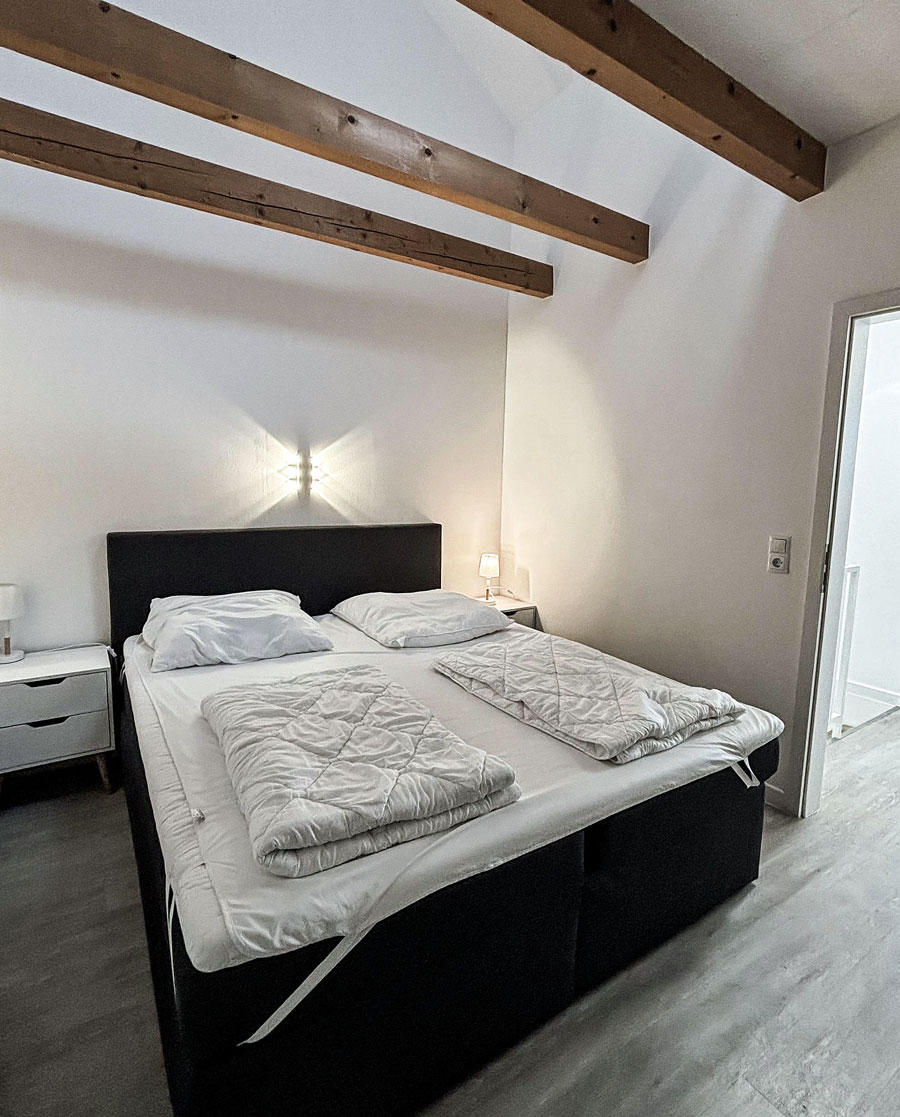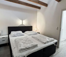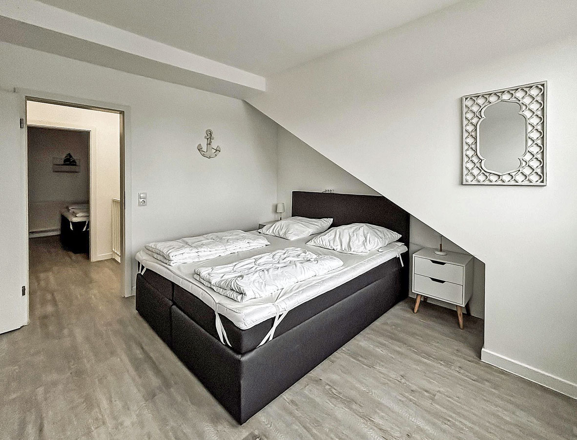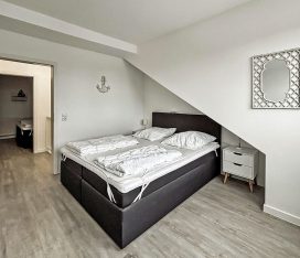Obergeschoss: 1. und 2. Schlafzimmer mit Doppelbett (durchgängige Matratze/ 180 x 200) und Kleiderschrank, Gäste-WC, Waschbecken und Spiegel