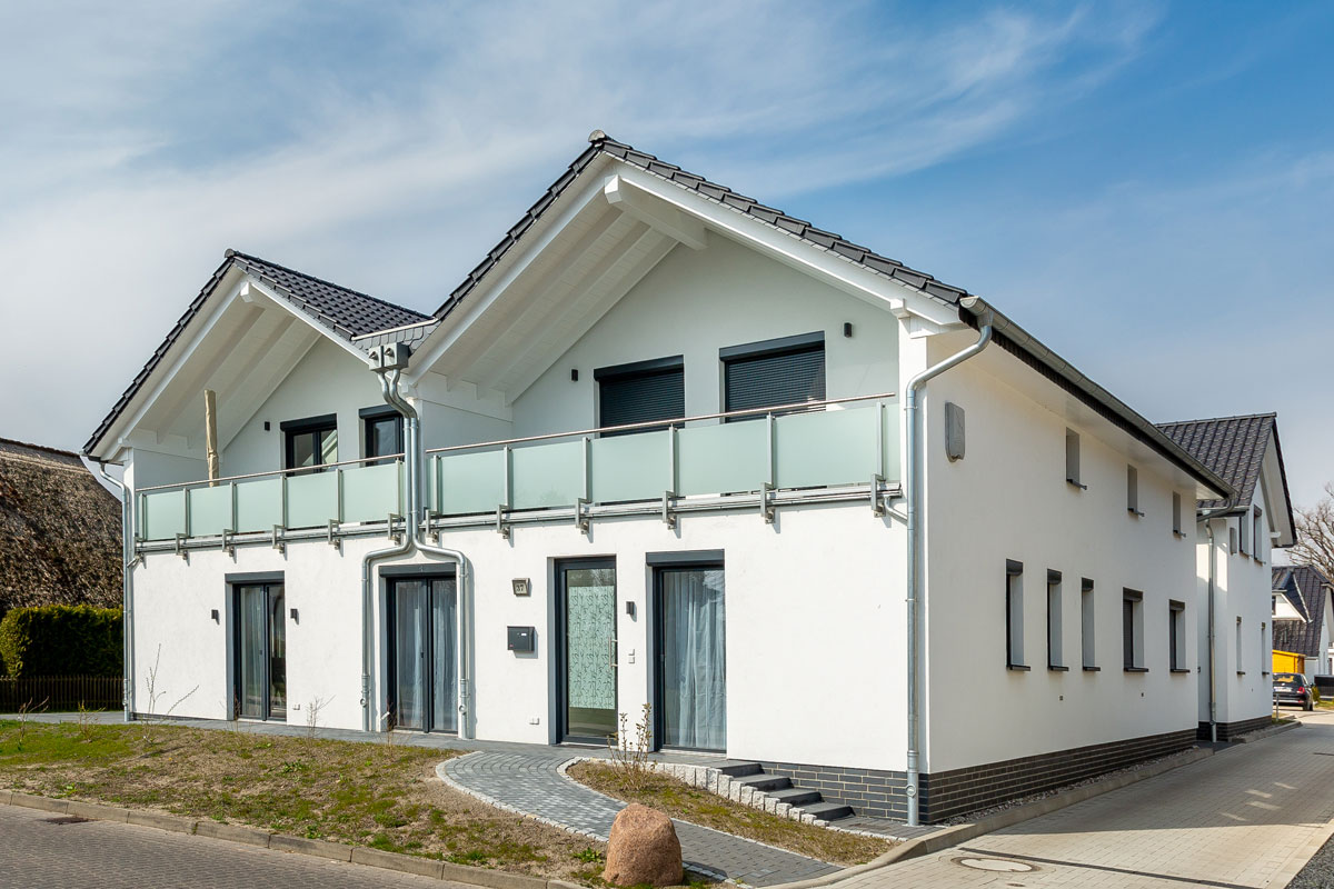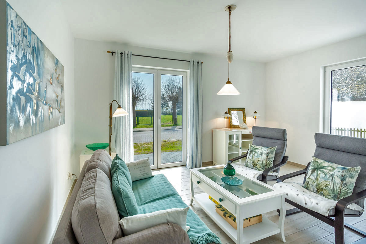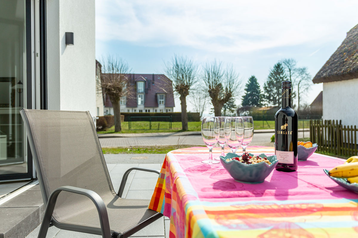 Alle Terrassentüren in der Wohnung sind mit elektrisch bedienbaren Rollläden abdunkelbar. Im Flur befindet sich die Garderobe mit Spiegel, Schuhbank und Schirmständer. Die 25m² große Terrasse mit Blick auf den Bodden bietet viel Platz und ist mit Gartenmöbel für 4 Personen und Sonnenschirm ausgestattet.