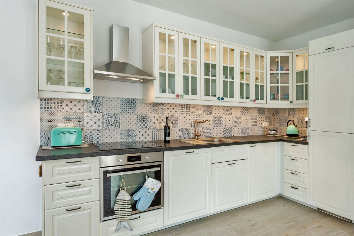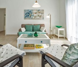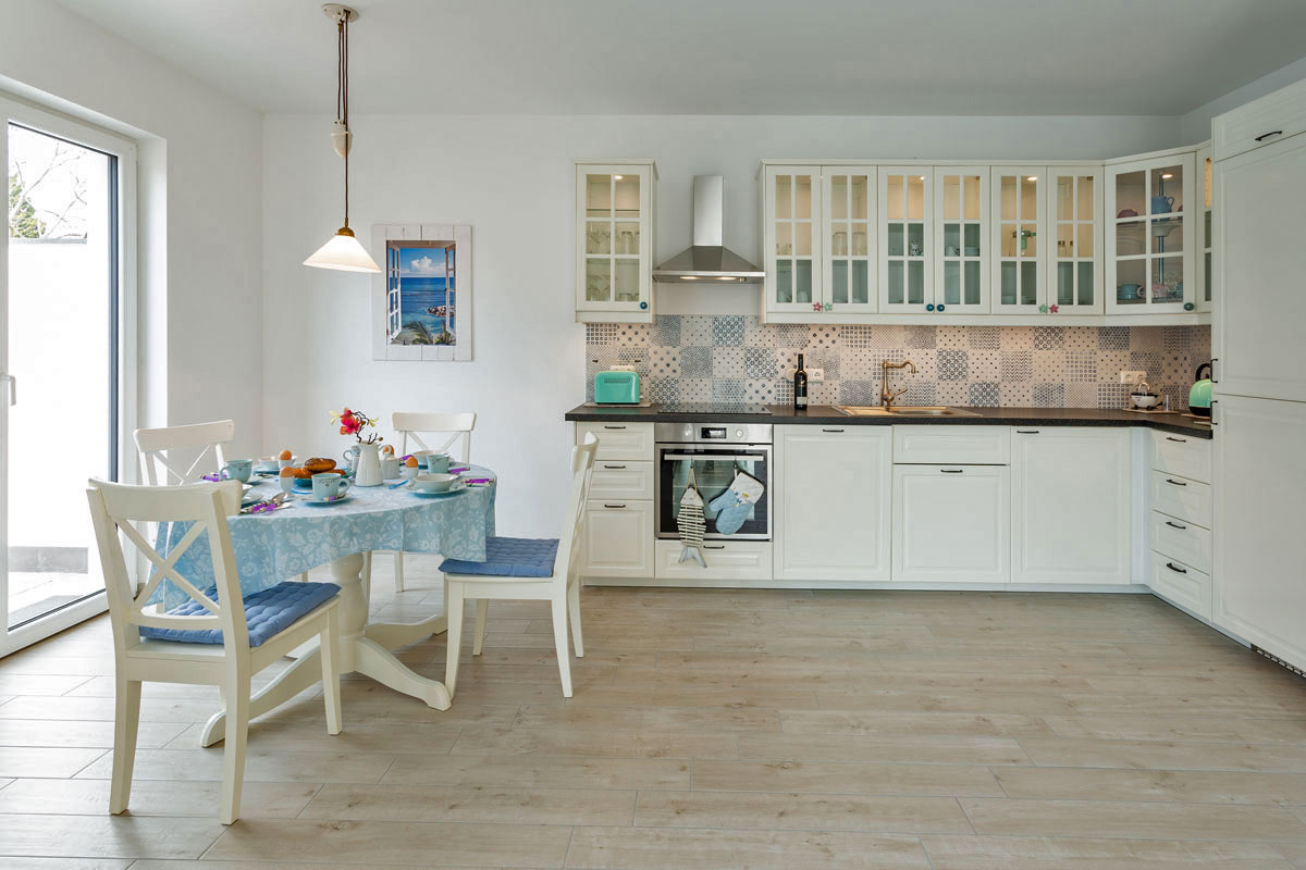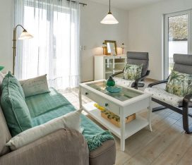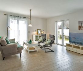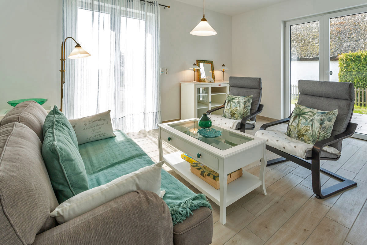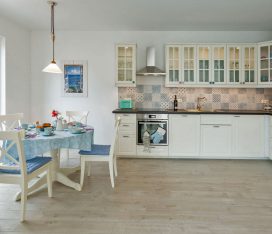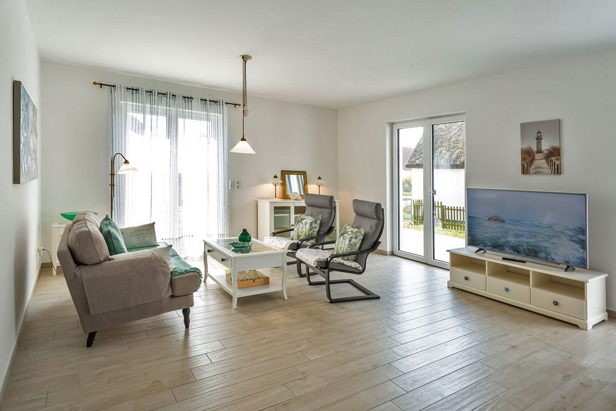 Die Unbeschwertheit des Urlaubs genießen mit viel Licht, viel Luft, viel Sonne. Es erwartet sie ein großzügiger Wohn- & Essbereich (33,74 m²) mit 3 großen Terrassentüren nach Süden und Westen. Eine gemütliche Couch und zwei Sessel laden zum Entspannen ein, zum Fernsehen (TV/Sat, 55 Zoll Flatscreen/ Smart-TV), Internet Surfen (kostenloses WLAN ) oder zu lustigen Spieleabenden (Gesellschaftsspiele vorhanden). Die große, 5m lange, voll eingerichtete Einbauküche (mit direkter und indirekter Beleuchtung) verfügt über einen 4-Plattenherd (Ceran), Backofen, Kühlschrank, Gefrierschrank, Geschirrspüler und weitere diverse Elektrogeräten wie eine Kaffeemaschine, Wasserkocher, Toaster, Eierkocher.