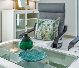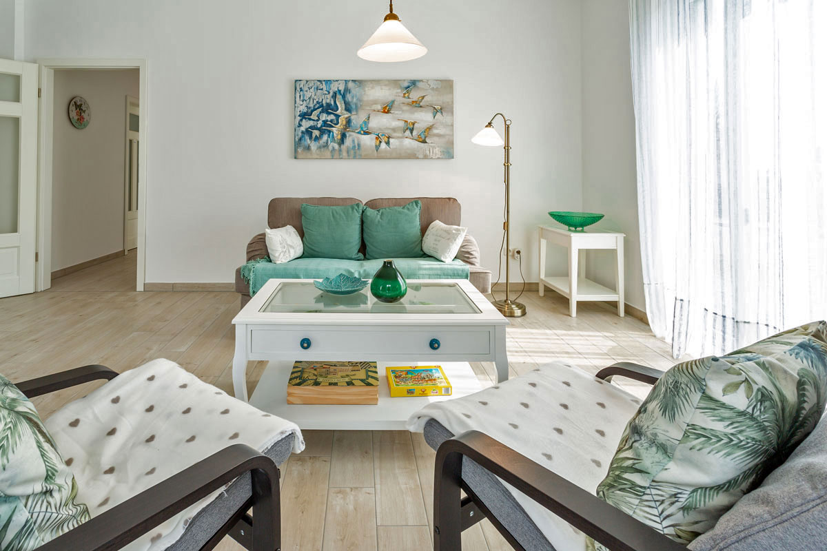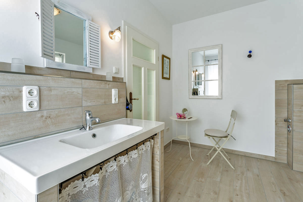 Die Wohnung ist eine Nichtraucherwohnung. Sie ist ganz in weiß eingerichtet, was sie sehr leicht und luftig wirken lässt. Wunderschöne Fliesen in Holzoptik (weiß gekalkte Buche) machen sie außerdem pflegeleicht. Alle Räume haben Fußbodenheizung.