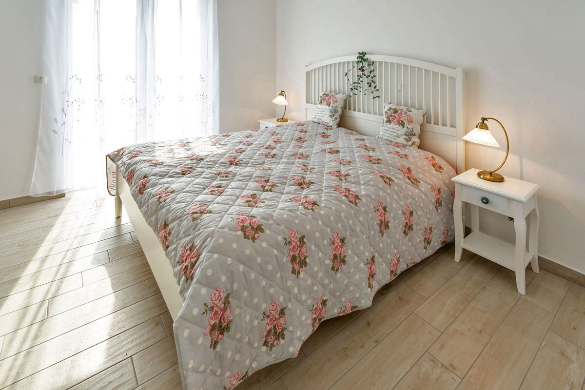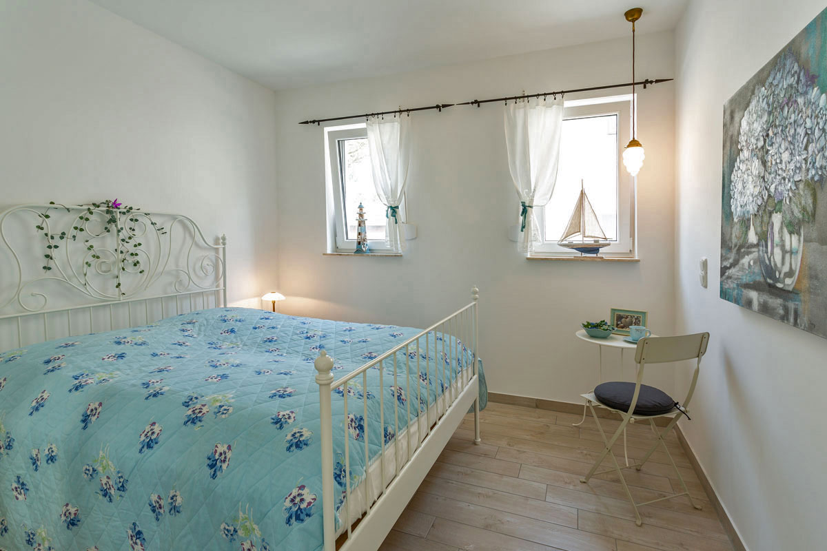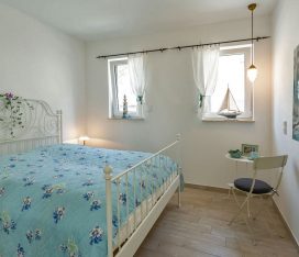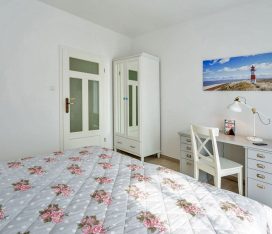 Das andere Schlafzimmer ist ebenfalls mit komfortablem Doppelbett (2 getrennte Matratzen je 80 x 200), geräumigem Kleiderschrank mit Spiegeltüren ausgestattet und zusätzlich einem kleinem Tisch. Die beiden Fenster sind nach Osten ausgerichtet und mit Rolladen versehen.
