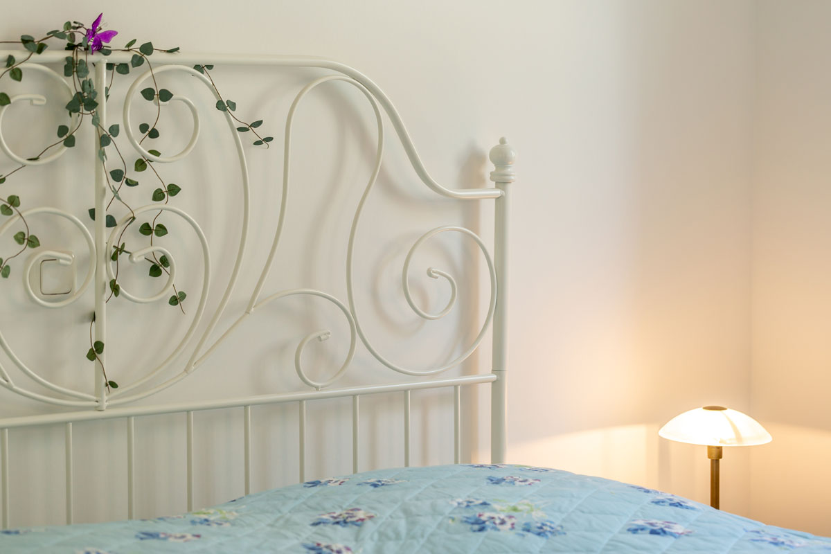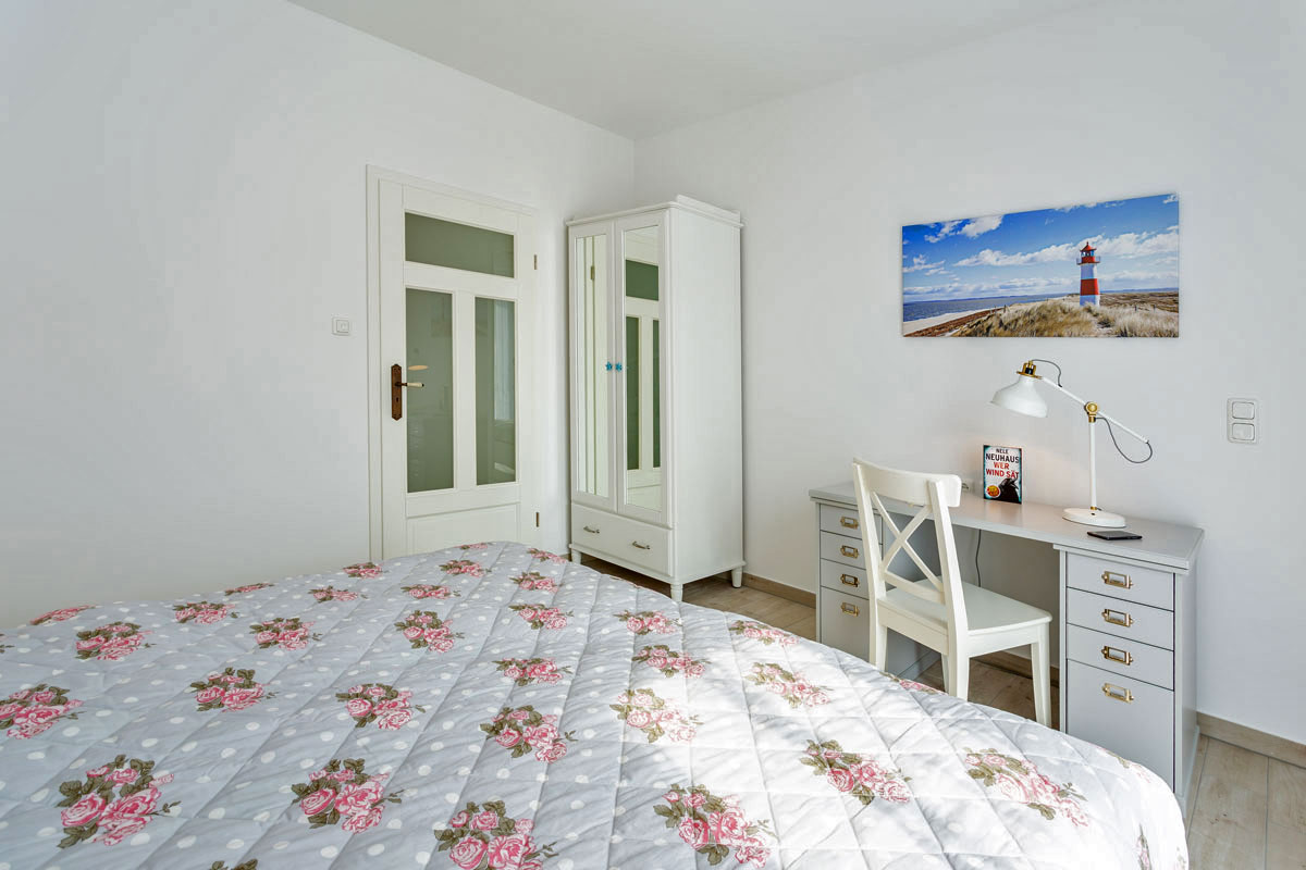 Ein Schlafzimmer ist mit komfortablem Doppelbett (2 getrennte Matratzen je 90 x 200) und geräumigem Kleiderschrank mit Spiegeltüren ausgestattet und zusätzlich noch mit einem großem Schreibtisch. Die große Terrassentür ist nach Süden ausgerichtet.