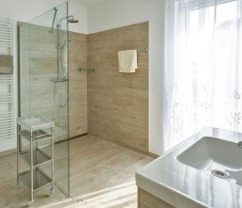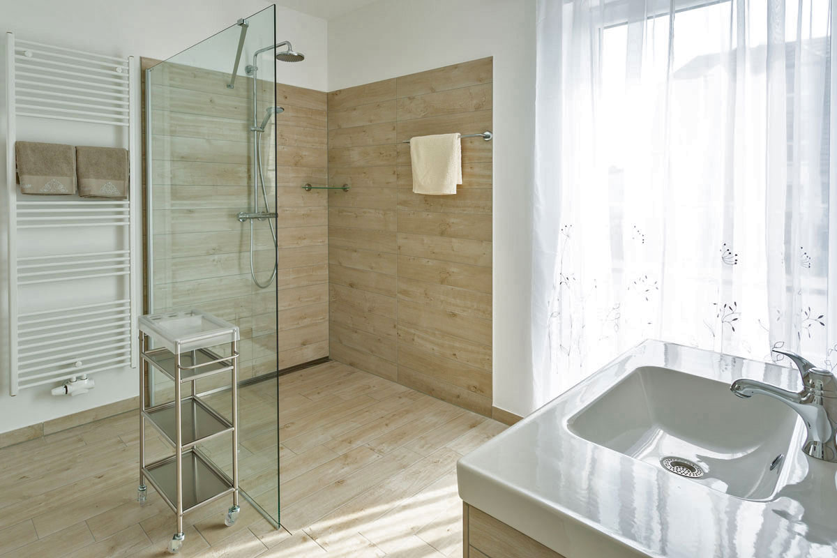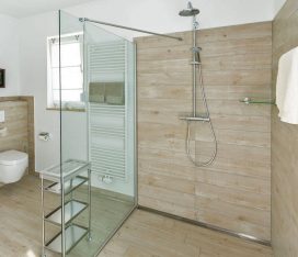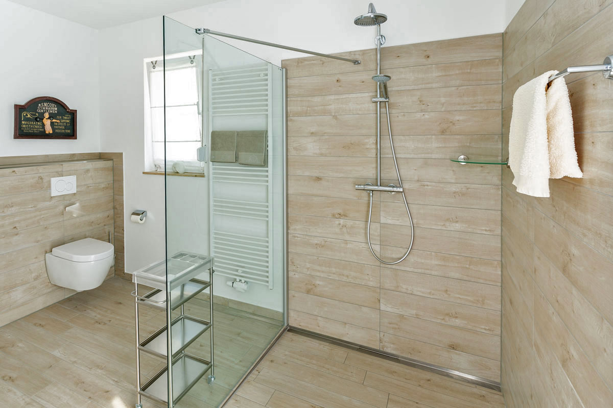 Das Badezimmer mit WC bietet einen großzügigen 140cm x 140cm großen ebenerdigen Duschbereich und eine Sitzecke für bequeme Körperpflege. Kosmetikspiegel, Föhn und Wäscheständer sind vorhanden. Das Fenster geht nach Osten und die große Terrassentür nach Süden.