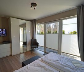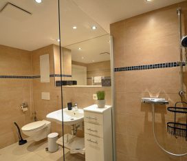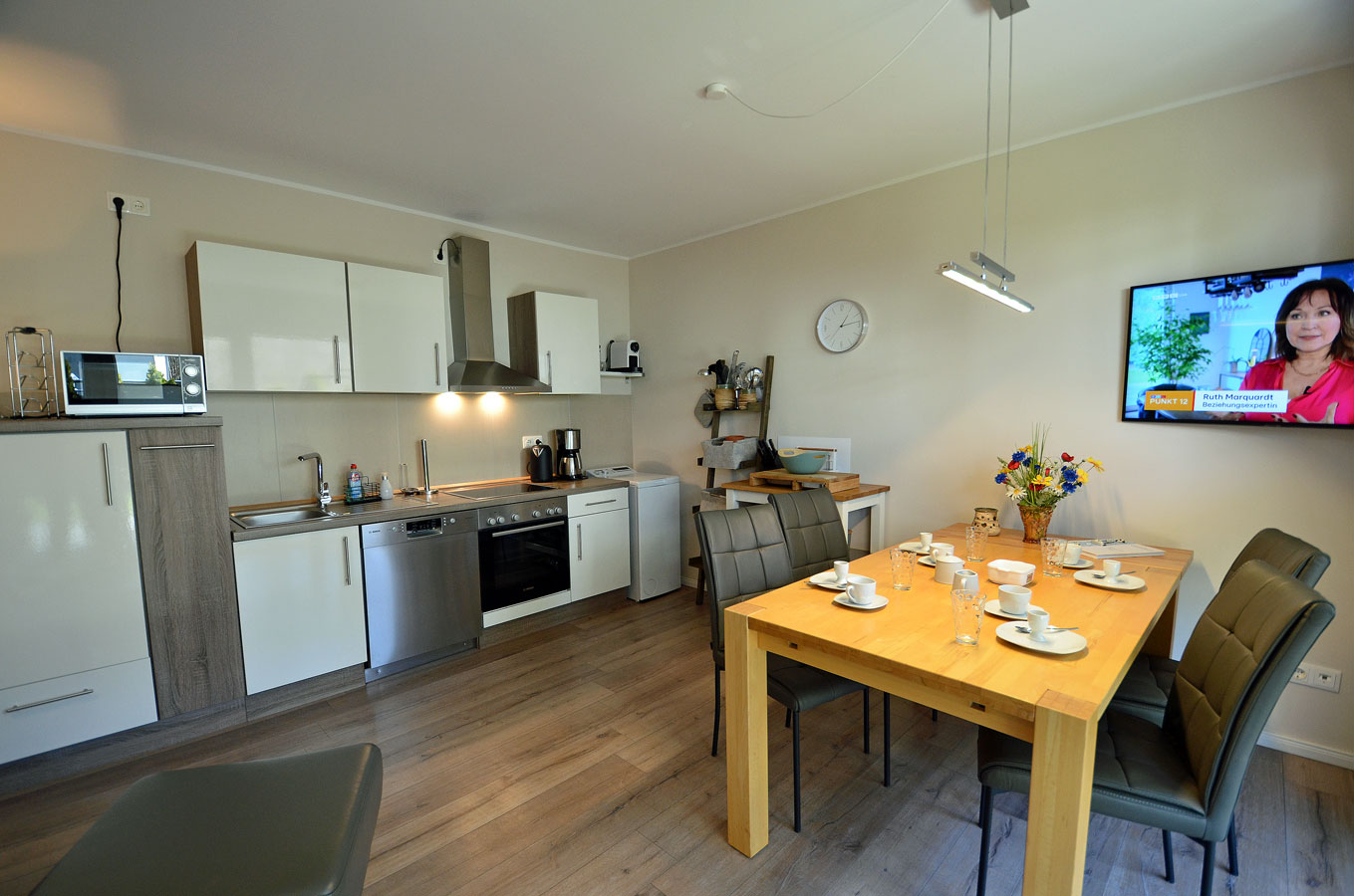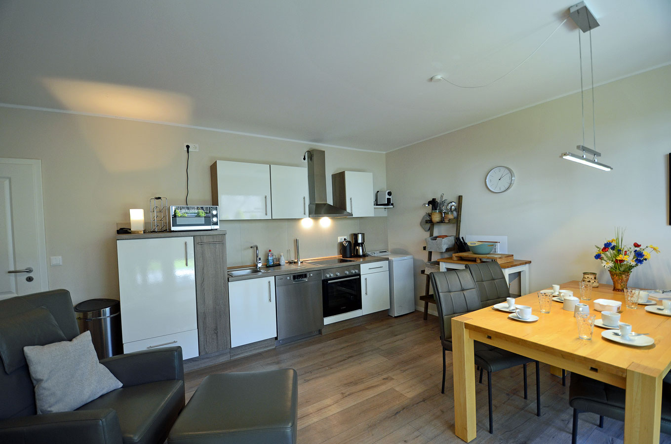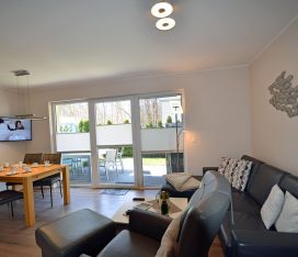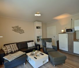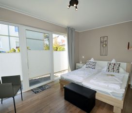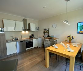 Die Wohnung mit nur 9 Wohneinheiten ist komfortabel und modern eingerichtet. Die voll ausgestattete Küche lässt keine Wünsche offen. Auf der großen Terrasse (Zugang vom Wohn- und Schlafzimmer) mit Standkorb, Tisch mit Stühlen können Sie die Mittags- und Abendsonne genießen. Die Wohnung ist kinderfreundlich. Bei uns sind bis zu 2 Hunde willkommen (Gebühr Euro 5,-/ pro Hund/ pro Nacht). Für die kleinen Gäste steht ein Tripp Trapp-Kinderstuhl und ein Kinderreisebett zur Verfügung. Alle Räume sind mit Fußbodenheizung ausgestattet.