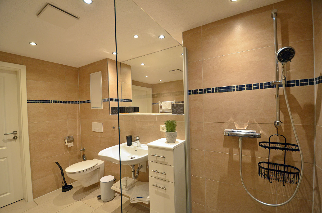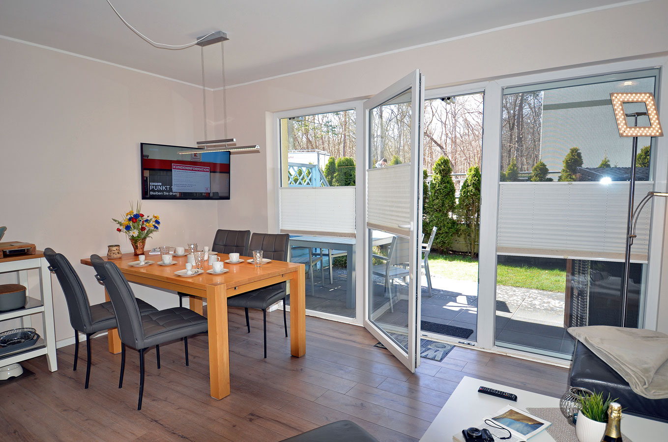 Parterre: großzügiger Wohn- Essbereich, gemütliche Couchlandschaft, TV/ Sat (Smart-TV Flatscreen), Radio/CD, Internet (WLAN), Bücher und Gesellschaftsspiele für gemütliche Abende, Fliegenschutzgitter im Wohnzimmer und in den Schlafräumen, offene komplett ausgestattete Einbauküche mit hochwertigen Geräten, Filter-und Kapselkaffeemaschine (Tchibo Cafissimo pure+) 4- Plattenherd (Ceranfeld), Backofen, Kühlschrank mit kleinem Gefrierfach, Geschirrspüler, Mikrowelle und diversen Elektrogeräten, Waschmaschine in der Küche vorhanden, großes Bad mit ebenerdiger Dusche und WC