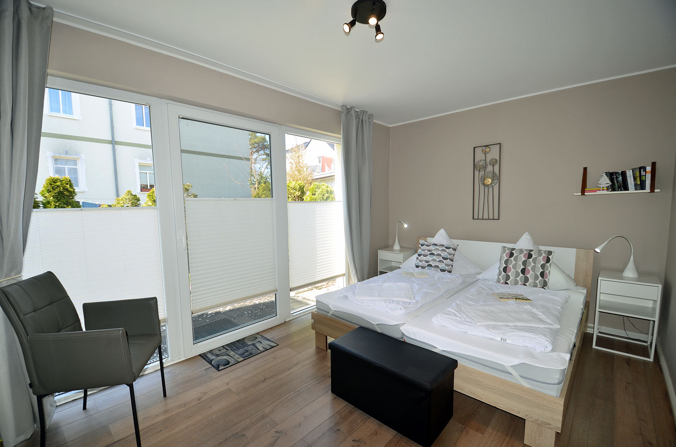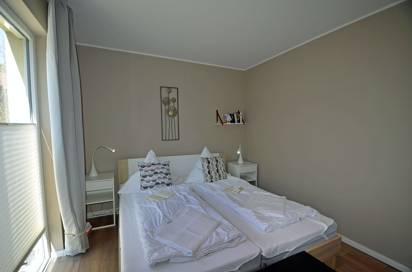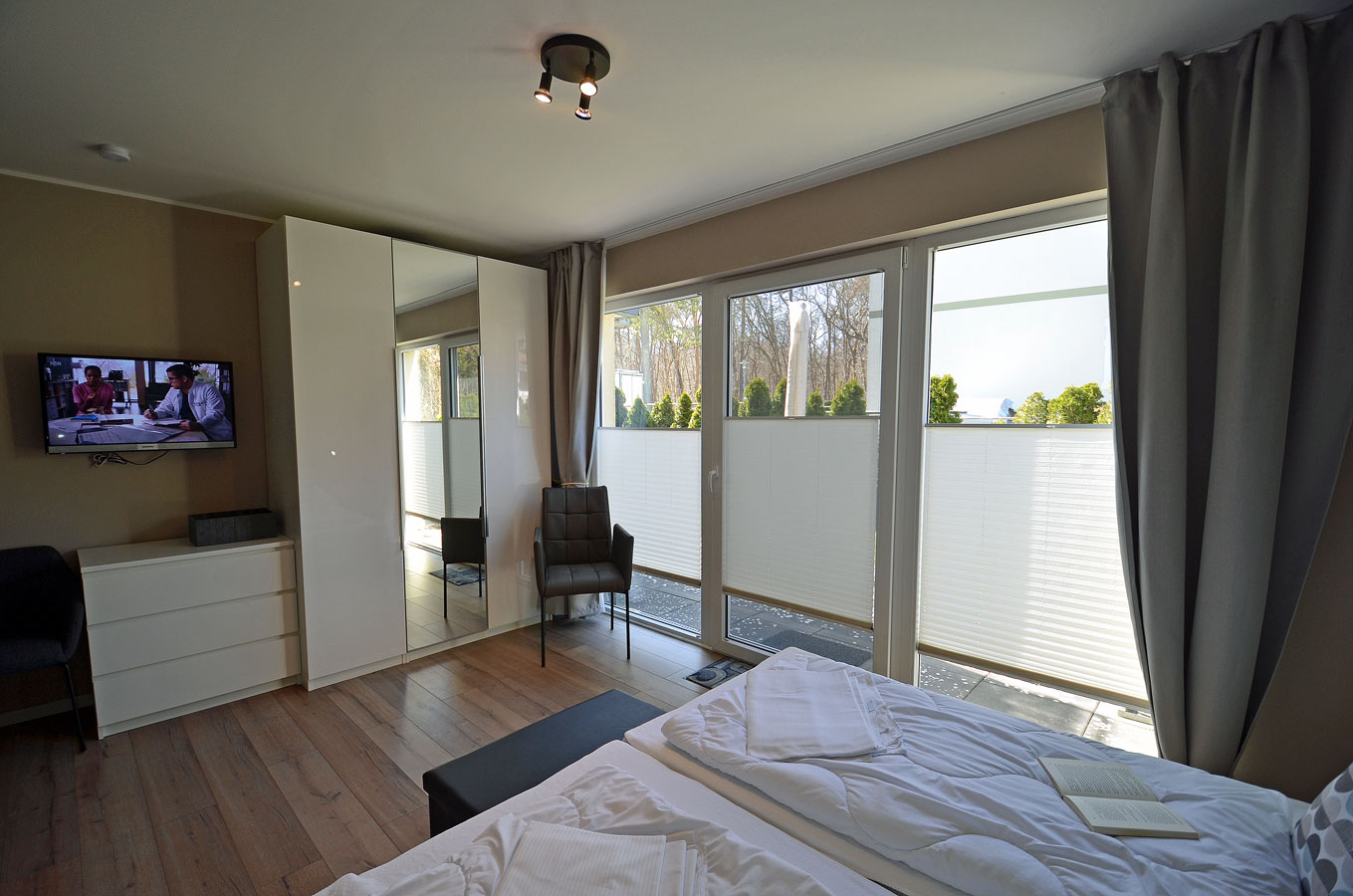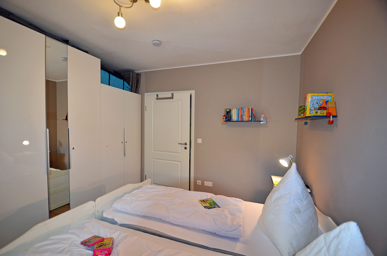 1. Schlafzimmer mit Doppelbett (2 Matratzen je 90×200), TV/Sat (Flatscreen) und Kleiderschrank, 2. Schlafzimmer zwei Einzelbetten(zusammengestellt) mit je einer Matratze 90×200 und Kleiderschrank