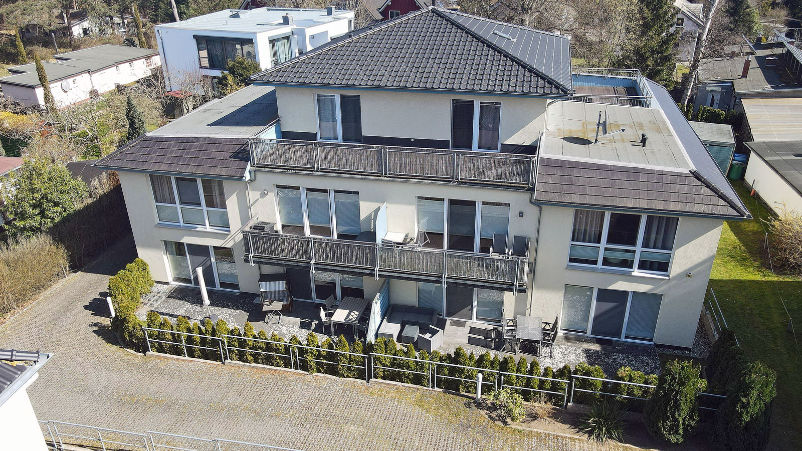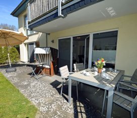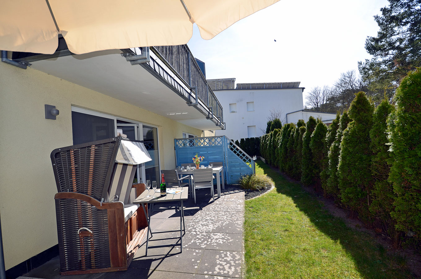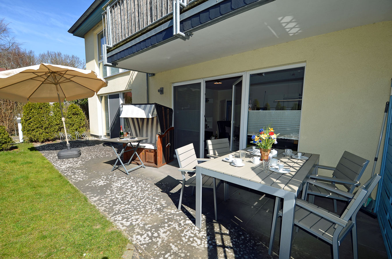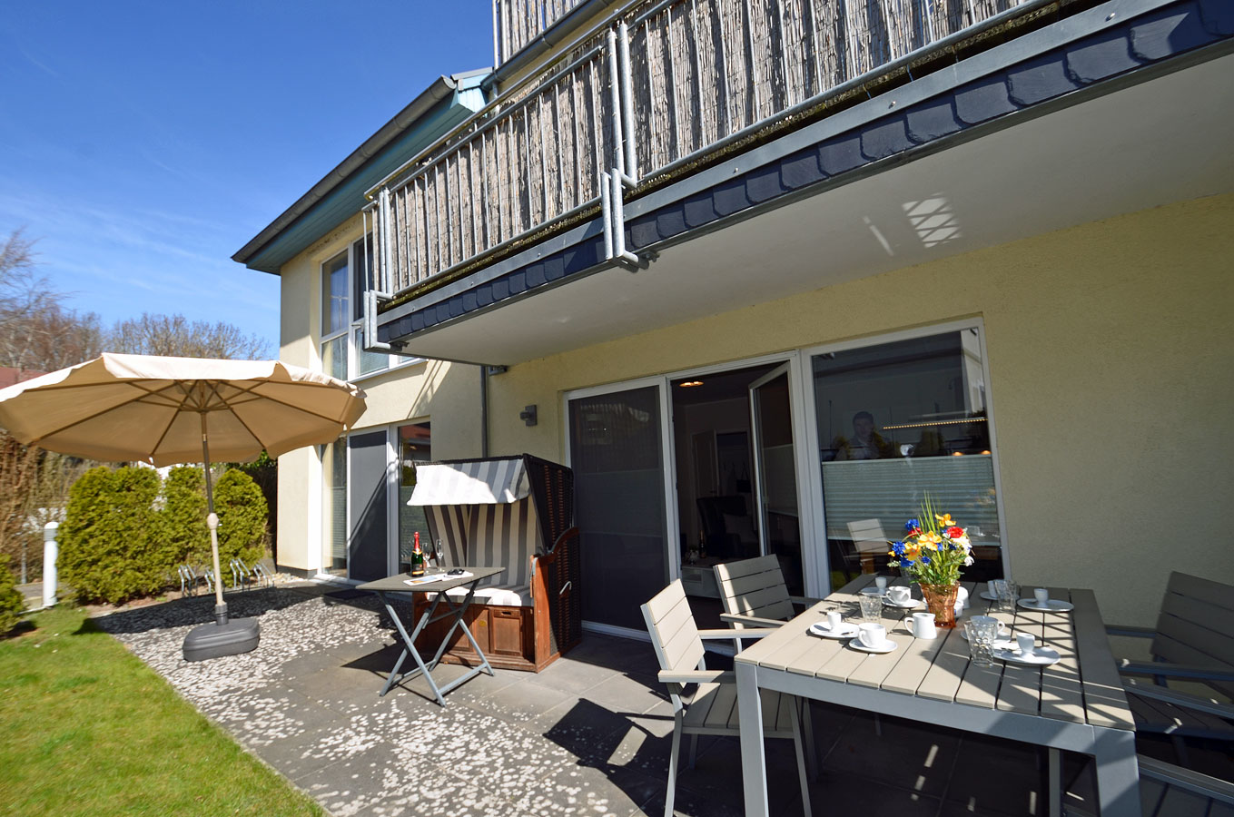 Außenbereich: große Terrasse (20 m²) mit Strandkorb, Tisch und Gartenstühle, Sonnenschirm vorhanden, Grillmöglichkeit besteht (Gemeinschaftsgrill)