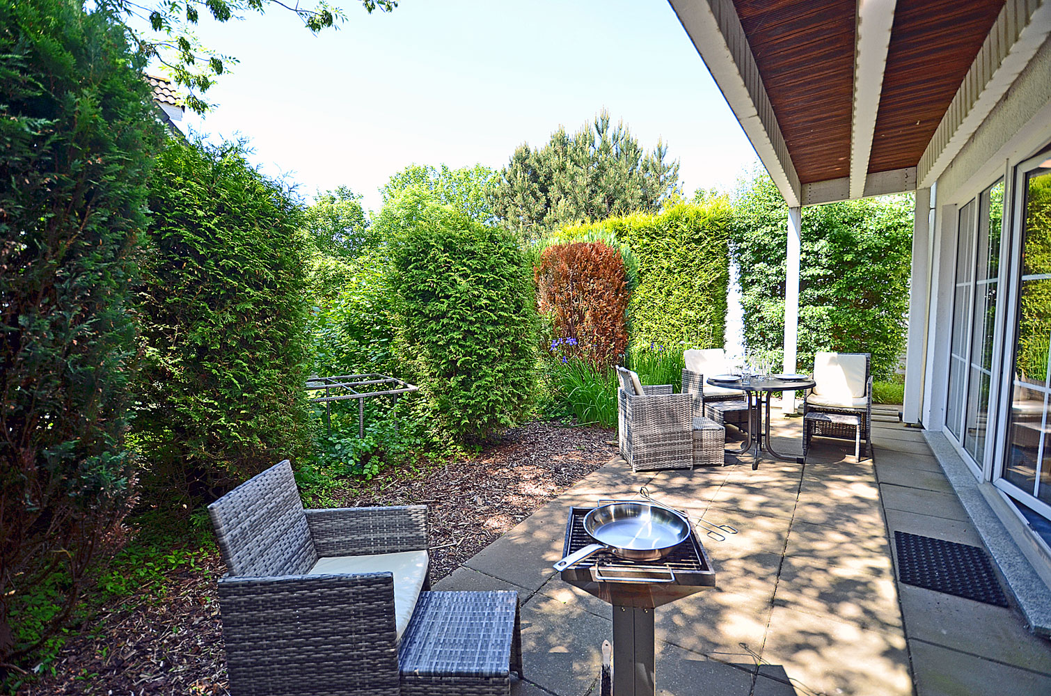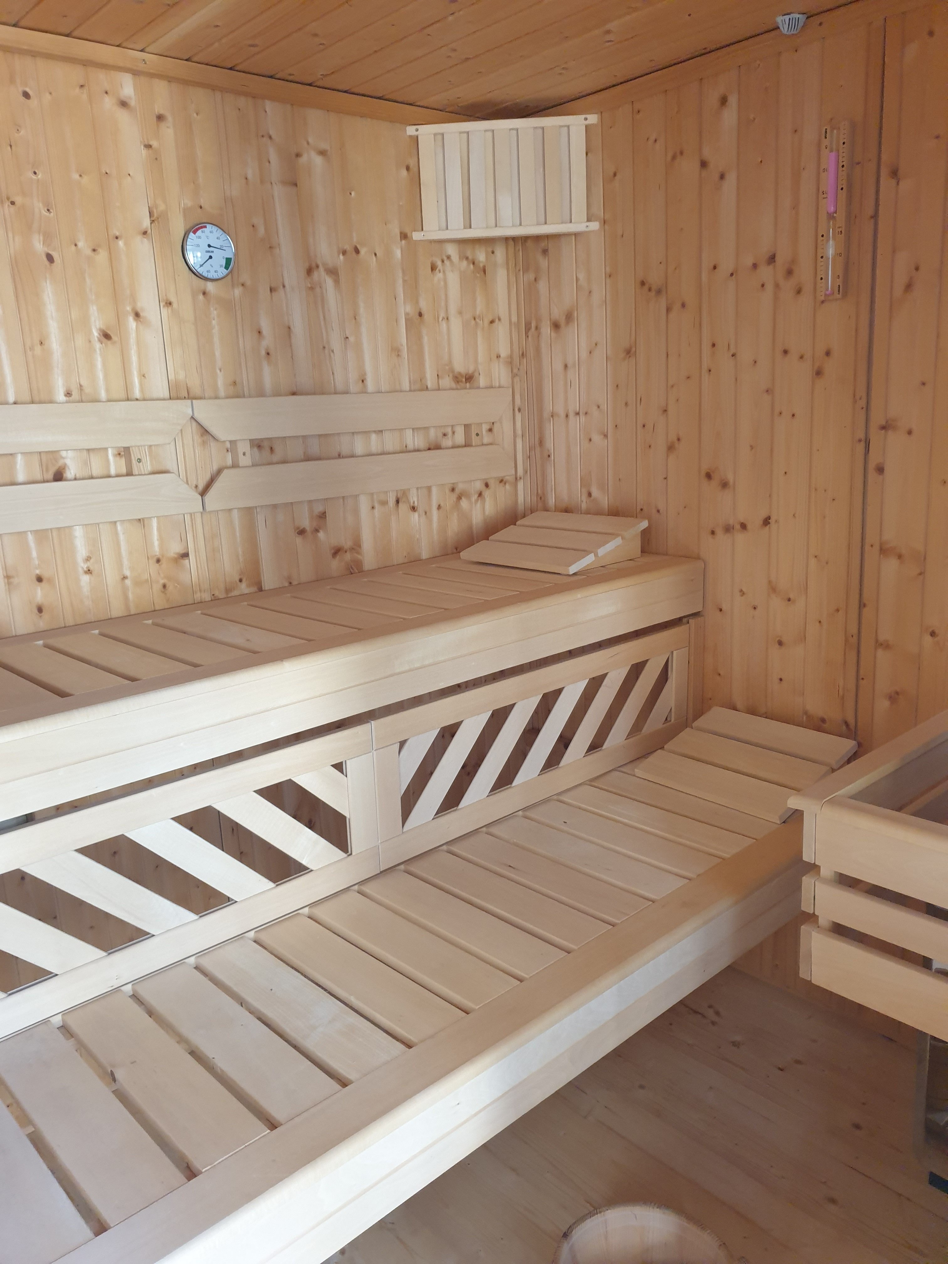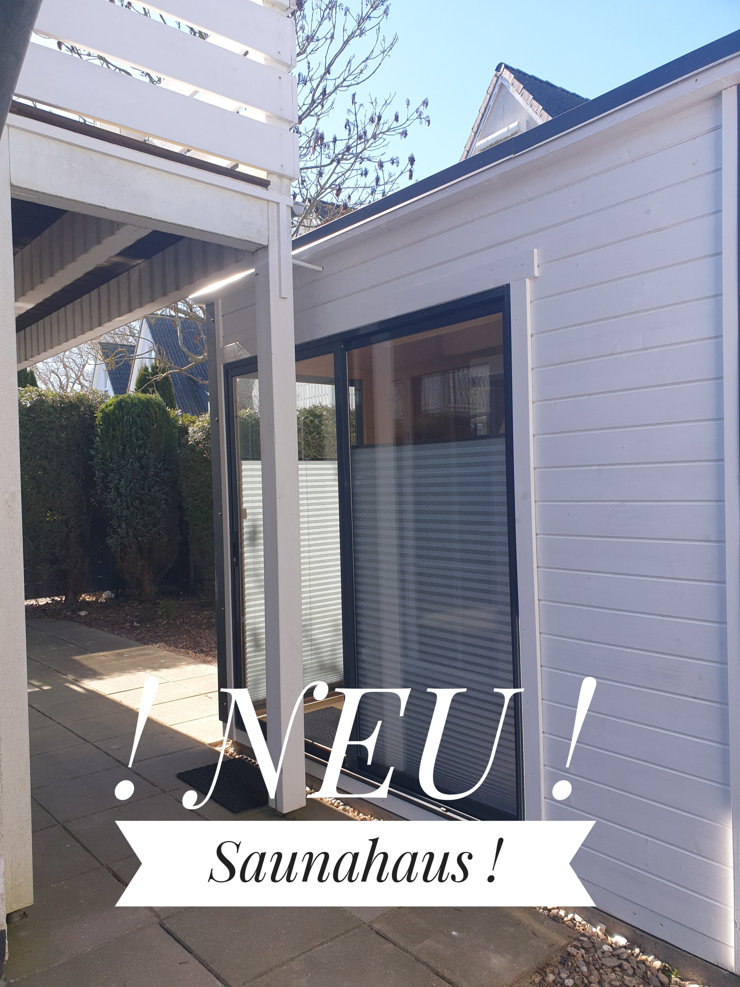 Außenbereich: Terrasse mit 4 Gartenstühlen, Grillmöglichkeit besteht (Grill vorhanden), die Außensauna mit 2 Bänken für 4-6 Personen ist wettergeschützt in einer kleinen Holzhütte und grenzt an die Terrasse, eigener PKW-Stellplatz vor dem Objekt, Haustiere nach Absprache
