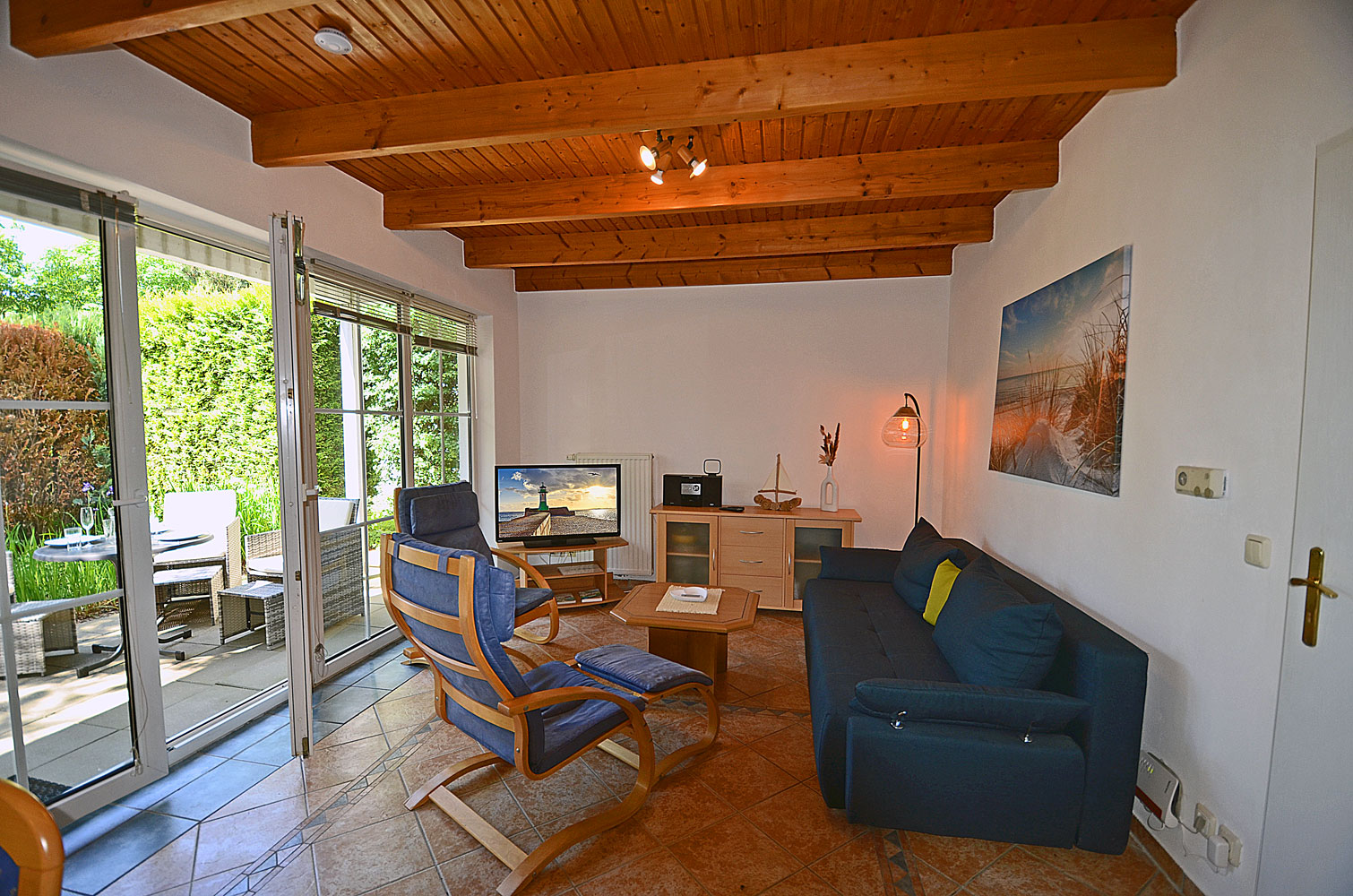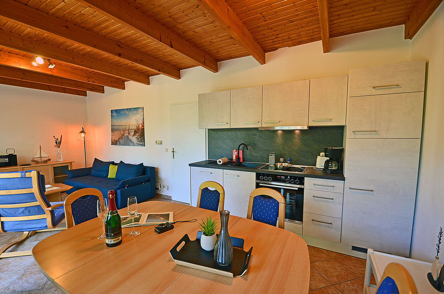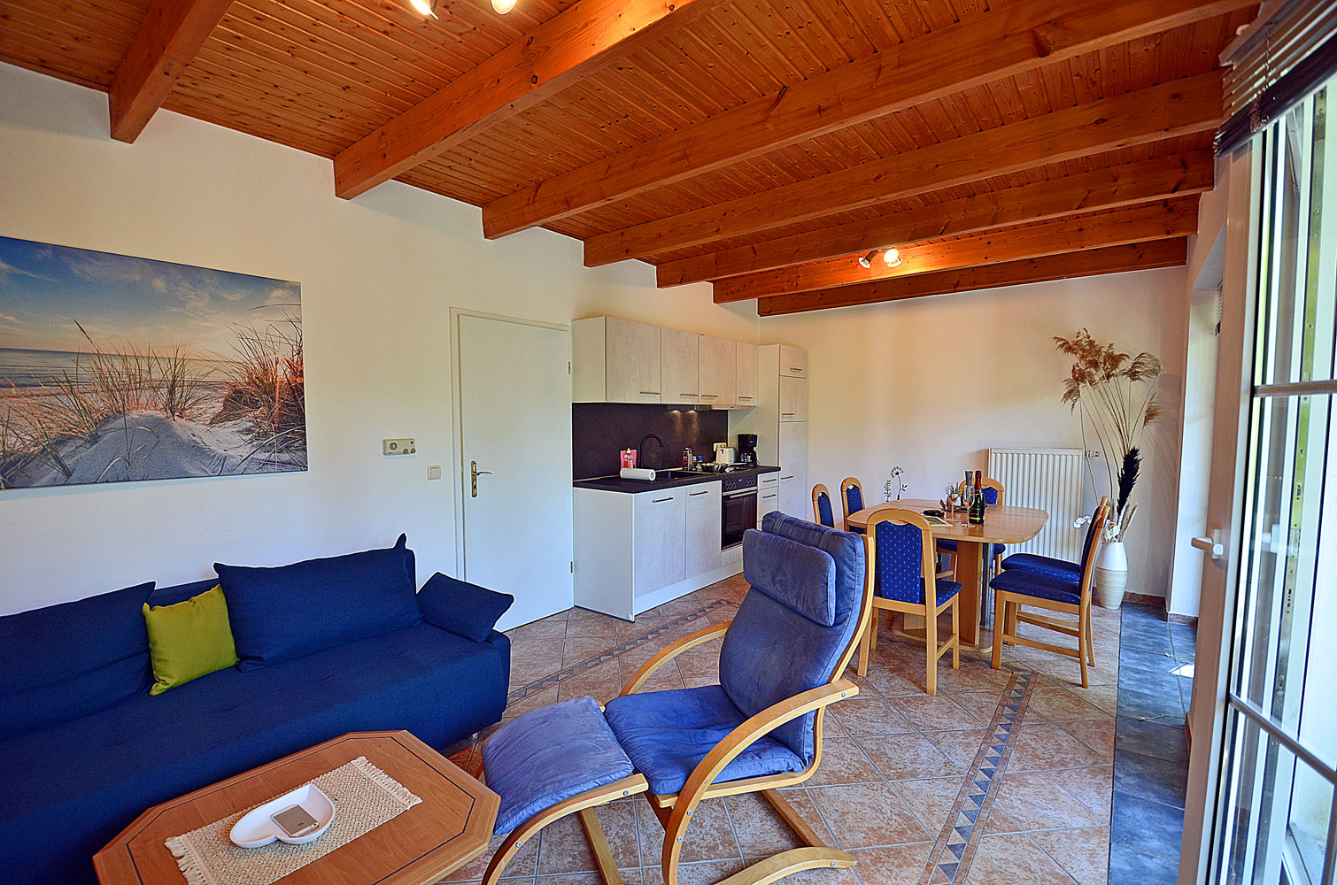 gemütliches Wohnzimmer mit Essecke und Couch mit Schlaffunktion, TV/Sat (Flatscreen/Smart-TV), Radio/ CD, kostenloses WLAN, Bücher für gemütliche Lesestunden, komplett ausgestattete Küche mit 4 Plattenherd (Induktion) und Backofen, Geschirrspüler, Kühlschrank mit großem Gefrierfach, Filterkaffeemaschine und diversen Elektrogeräten