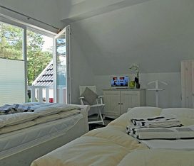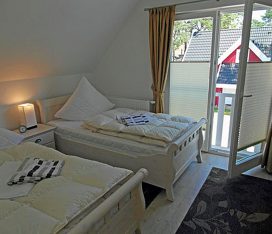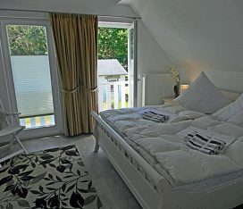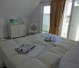 Obergeschoss: 1. Schlafzimmer mit Doppelbett, Kleiderschrank und TV (Flatscreen), 2. Schlafzimmer mit zwei Einzelbetten, Kleiderschrank und TV (Flatscreen), Bad mit Badewanne und WC, Terrasse mit Gartenmöbeln und Sonnenschirm, Elektrogrill vorhanden