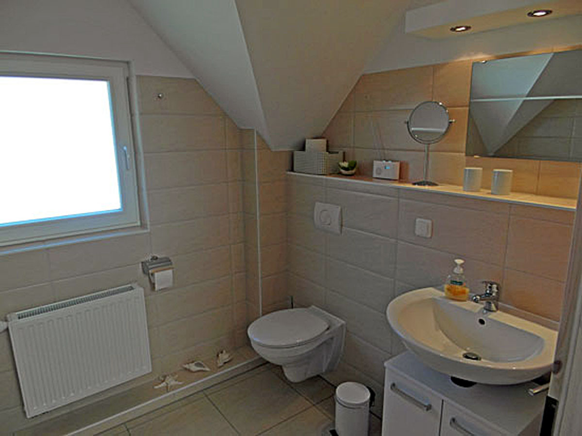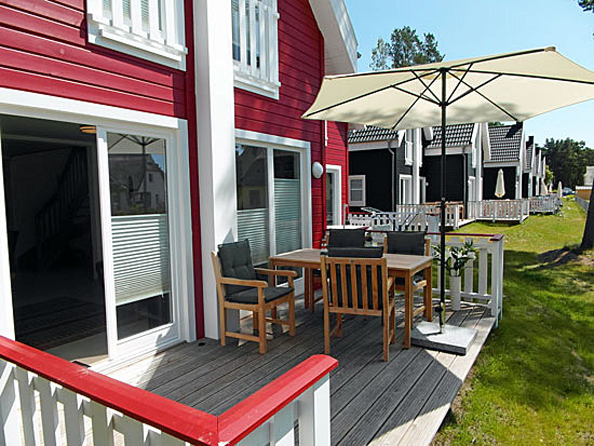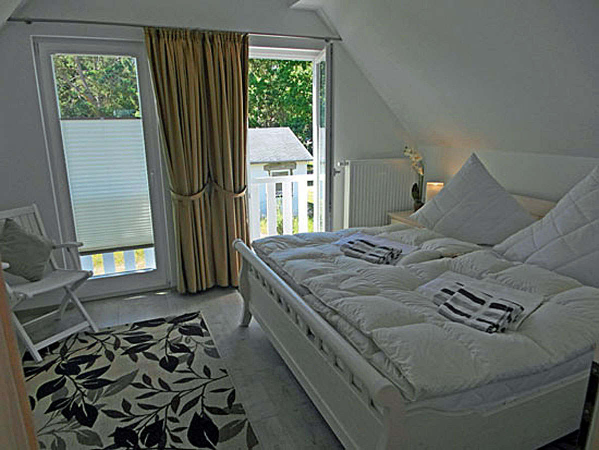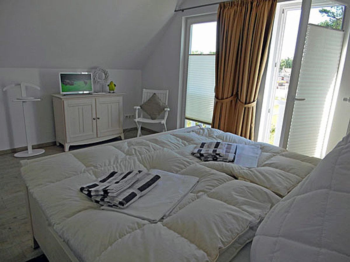 Obergeschoss: 1. Schlafzimmer mit Doppelbett, Kleiderschrank und TV (Flatscreen), 2. Schlafzimmer mit zwei Einzelbetten, Kleiderschrank und TV (Flatscreen), Bad mit Badewanne und WC, Terrasse mit Gartenmöbeln und Sonnenschirm, Elektrogrill vorhanden