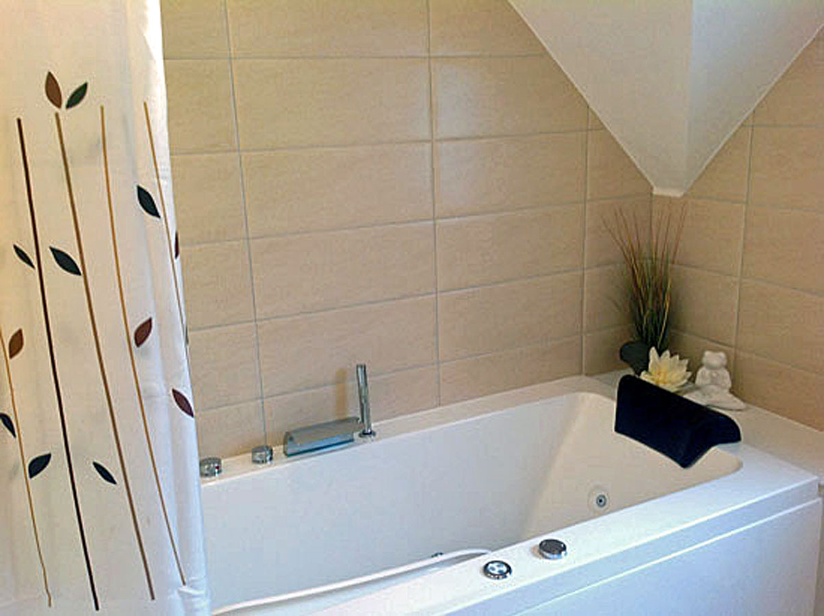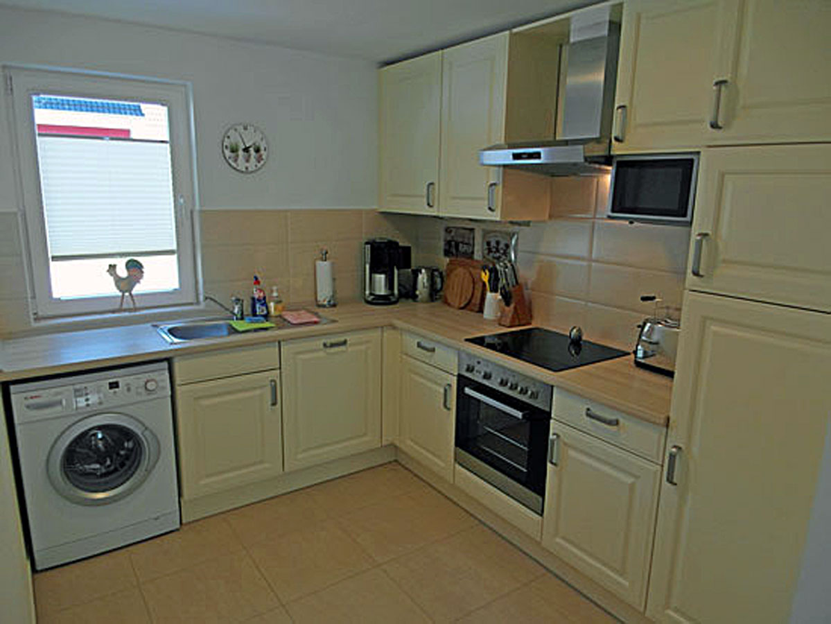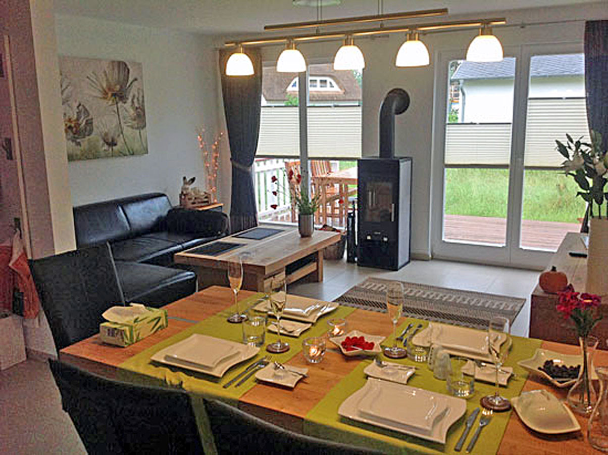 Erdgeschoss: großzügiger Wohn- Essbereich mit Fußbodenheizung und Kamin, gemütliche Couchlandschaft mit Schlaffunktion, TV/Sat (Flatscreen), Blu-ray Player, komplett ausgestattete Einbauküche mit Waschmaschine, 4-Plattenherd (Ceranfeld/Induktion), Backofen, Kühlschrank mit kleinem Gefrierfach, Mikrowelle, Geschirrspüler und diversen Elektrogeräten, 1. Bad mit Infrarotsauna, Dusche und WC,