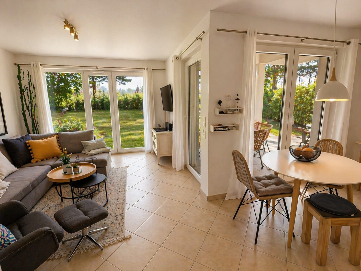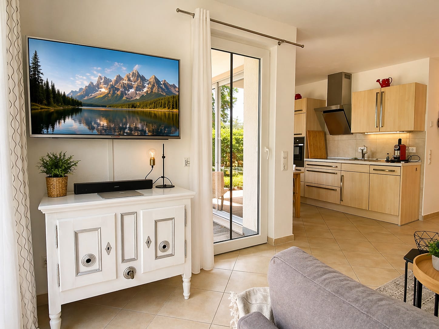 Wohn- Essbereich mit gemütlicher vollwertiger Ausziehcouch (140cm × 200cm) und Sessel, Terrassenzugang, TV/ Sat (Flatscreen), kostenfreies Internet (WLAN), Radio (Empfang über TV), moderne offene komplett ausgestattete Einbauküche mit 4-Plattenherd (Ceranfeld), Backofen, Mikrowelle, Kühlschrank mit kleinem Gefrierfach, Geschirrspüler und diversen Elektrogeräten, großzügiges Schlafzimmer mit Doppelbett (160 x 200 / durchgehende Matratze) und TV, großer Kleiderschrank, Tresor und Terrassenzugang, komfortables Bad mit Dusche/WC, Fön und Kosmetikspiegel, überdachte Terrasse mit Gartenmöbeln.