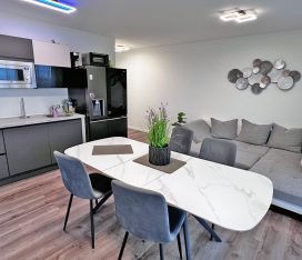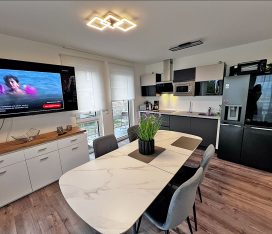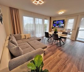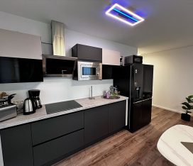 Wohn- Esszimmer mit offenen modernen Küchenbereich, gemütliche Couch mit Schlaffunktion, TV/Sat (Flatscreen), Internet/ WLAN ist kostenfrei, Fußbodenheizung, Bücher und Gesellschaftsspiele für gemütliche Abende, komplett mit Geschirr ausgestattete Einbauküche mit 4- Platteninduktionsherd (Ceranfeld), Mikrowelle, Kühlschrank mit großem Gefrierfach (Kühl-/ Gefrierkombination), Geschirrspüler, Kaffeemaschine (Filter), Minitischofen, Toaster und Wasserkocher