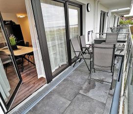 Außenbereich: großer Südbalkon mit Meerblick und Balkonmöbel