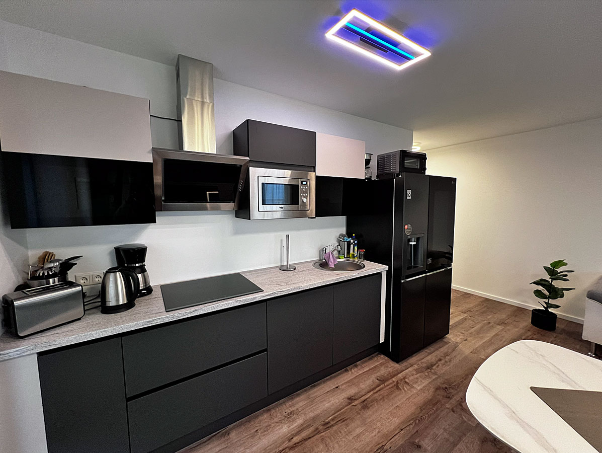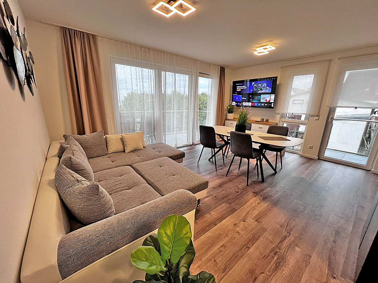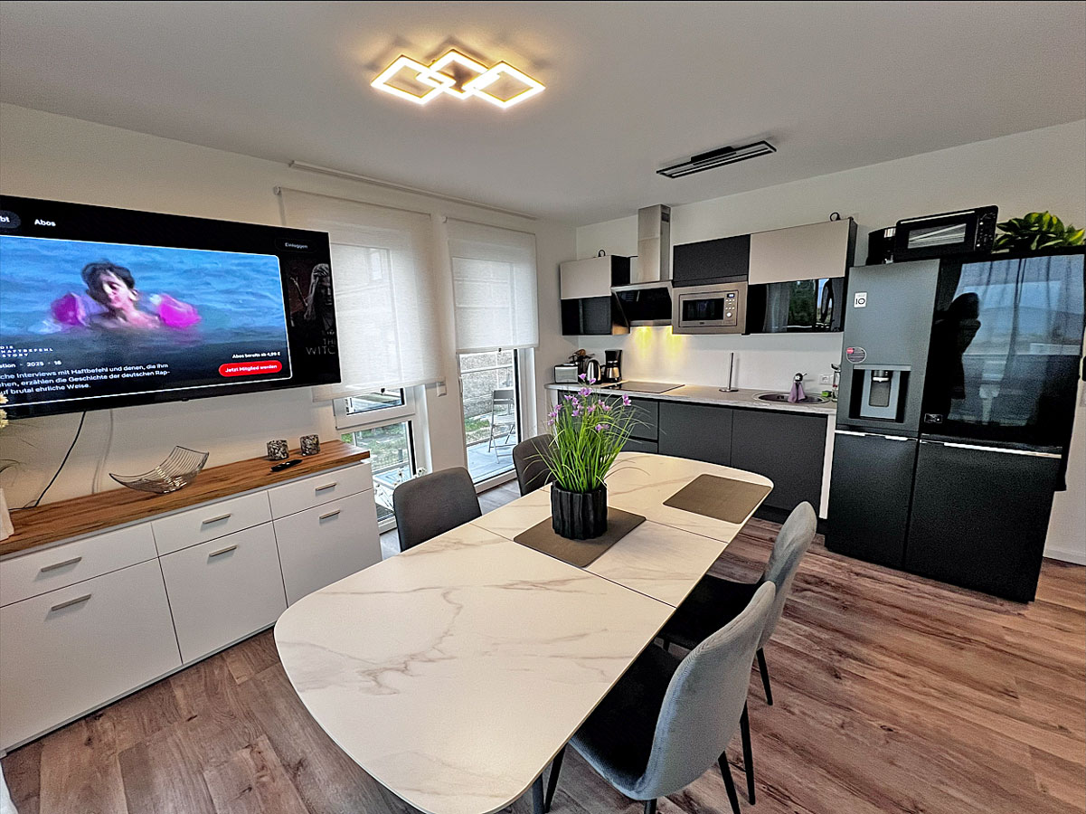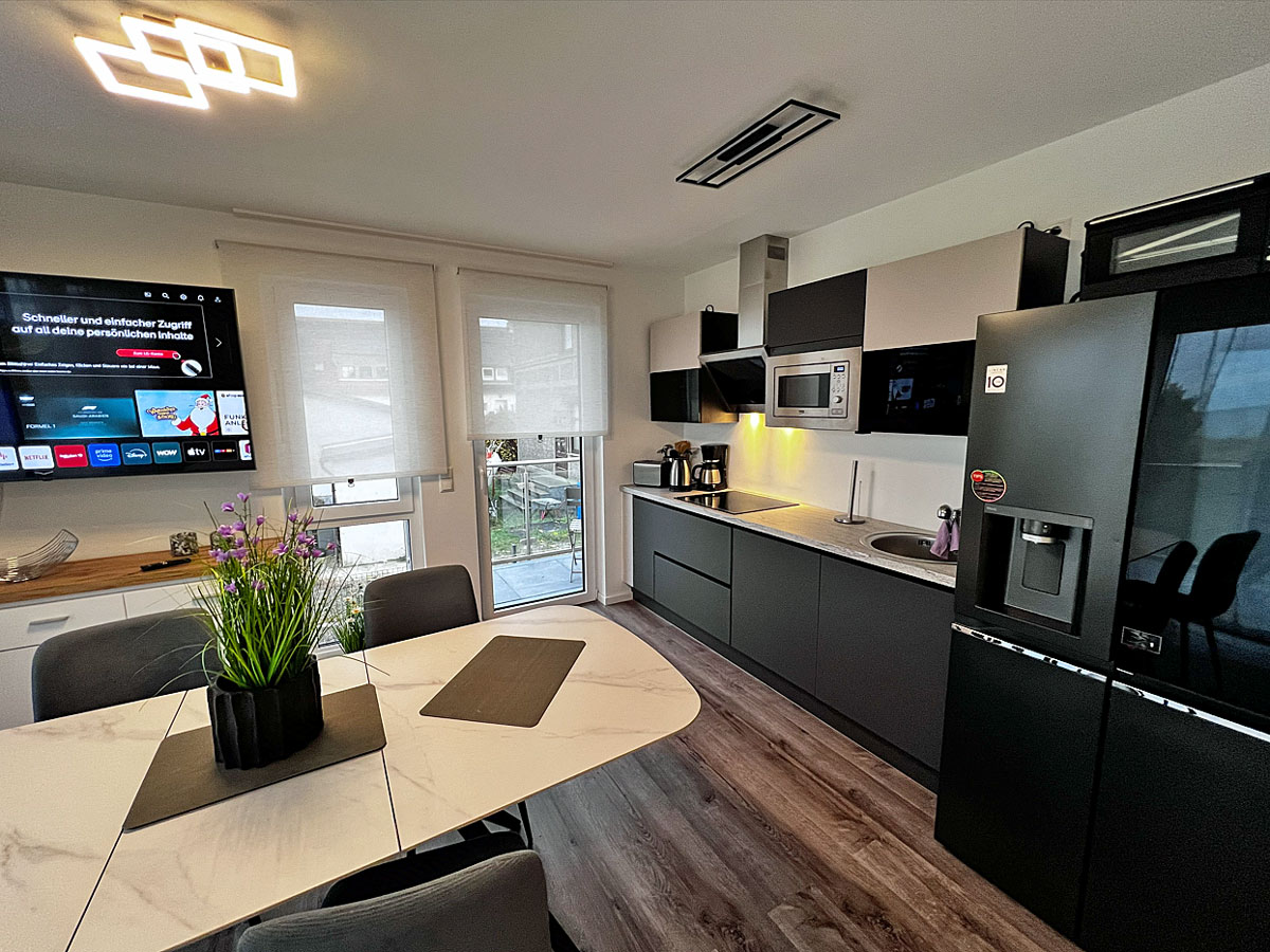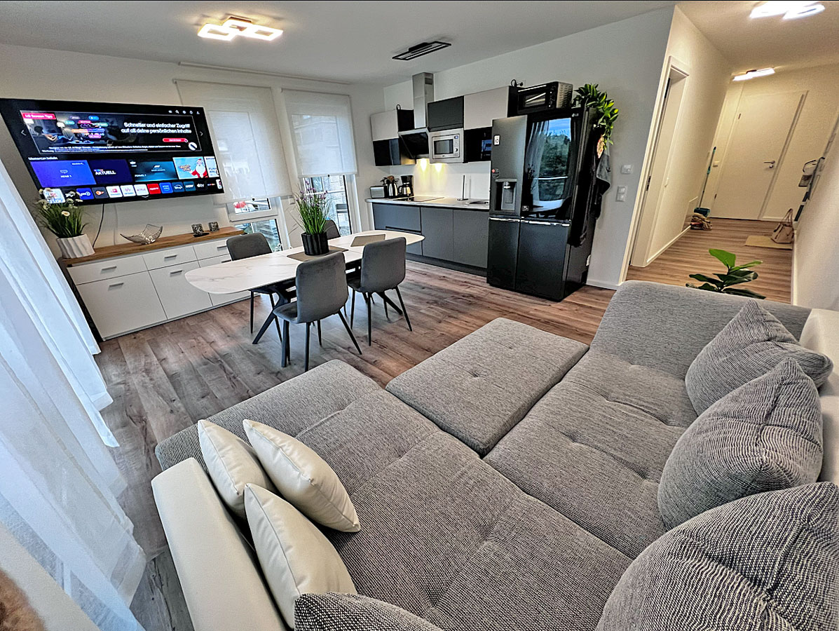 Wohn- Esszimmer mit offenen modernen Küchenbereich, gemütliche Couch mit Schlaffunktion, TV/Sat (Flatscreen), Internet/ WLAN ist kostenfrei, Fußbodenheizung, Bücher und Gesellschaftsspiele für gemütliche Abende, komplett mit Geschirr ausgestattete Einbauküche mit 4- Platteninduktionsherd (Ceranfeld), Mikrowelle, Kühlschrank mit großem Gefrierfach (Kühl-/ Gefrierkombination), Geschirrspüler, Kaffeemaschine (Filter), Minitischofen, Toaster und Wasserkocher
