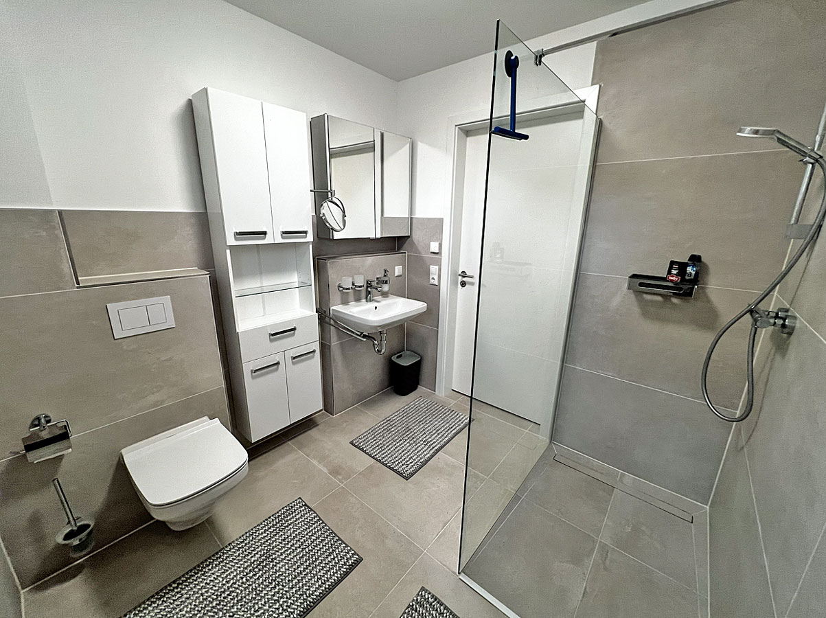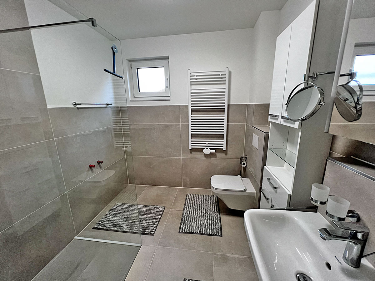 1. Bad mit großer ebenerdiger Dusche, WC mit Waschtisch, Kosmetikspiegel