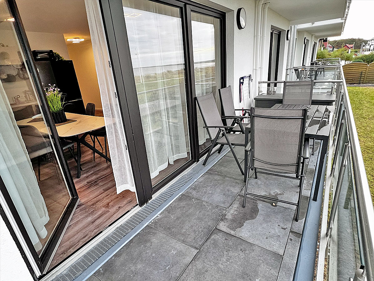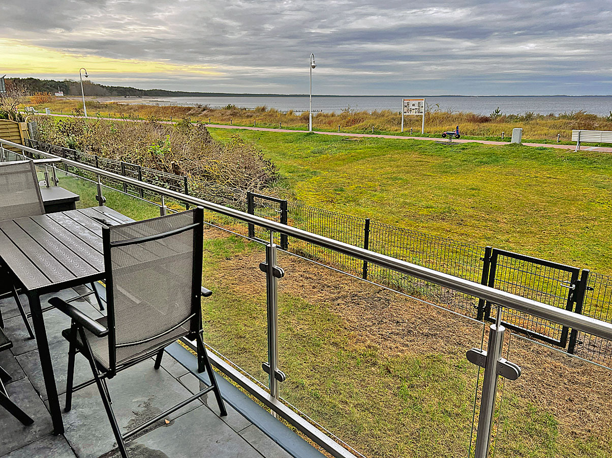 Außenbereich: großer Südbalkon mit Meerblick und Balkonmöbel
