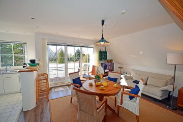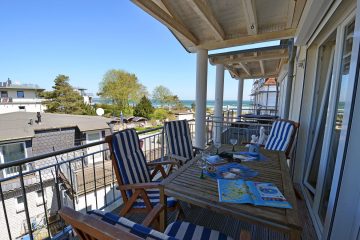 Wohn- Essbereich mit gemütlicher Ausziehschlafcouch, TV/ Sat (Flatscreen), Radio/ CD, offene komplett ausgestattete Einbauküche mit 4- Plattenherd (Ceranfeld), Backofen, Kühlschrank mit großem Gefrierfach, Mikrowelle, Geschirrspüler und diversen Elektrogeräten, Bad mit Fußbodenheizung, Dusche/ WC und Waschmaschine, Schlafzimmer mit Doppelbett (160 x 200), Balkon mit Gartenmöbeln und Seeblick (Ostsee)