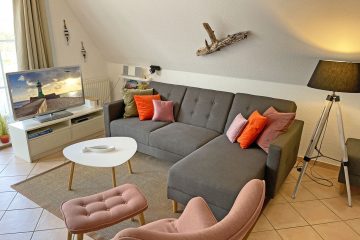 Obergeschoss: gemütliches Wohnzimmer mit Essecke und Couchlandschaft, TV/ Sat, DVD- / Blu-ray Player, Radio/ CD, Büchern und Spiele für gesellige Abende, kostenfreies WLAN, komplett ausgestattete Einbauküche Ceran-Kochfeld, Backofen mit Umluft, Geschirrspüler, Mikrowelle, Kühlschrank mit Gefrierfach, Waschmaschine und diversen Elektrogeräten, Schlafzimmer mit zwei Einzelbetten (90 x 200) und Kleiderkommode, Bad mit Dusche/ WC großer Südwestbalkon mit Gartenmöbeln Dachgeschoss: separates Schlafzimmer mit ...